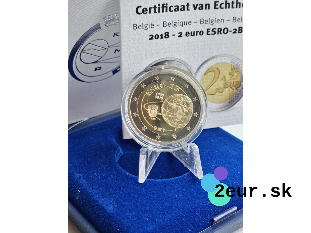 Belgická dvojeurová minca z roku 2018 bola vydaná pri príležitosti 50. výročia založenia Európskej organizácie pre výskum vesmíru (ESRO), ktorá sa neskôr stala súčasťou Európskej vesmírnej agentúry. Motív mince zobrazuje satelit obiehajúci okolo Zeme spolu s nápisom „ESRO“ a letopočtami 1968–2018, čo symbolizuje polstoročie európskej spolupráce vo vesmírnom výskume. Tento dizajn vzdáva poctu vedeckému pokroku a technologickým inováciám v oblasti kozmonautiky.