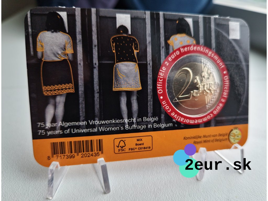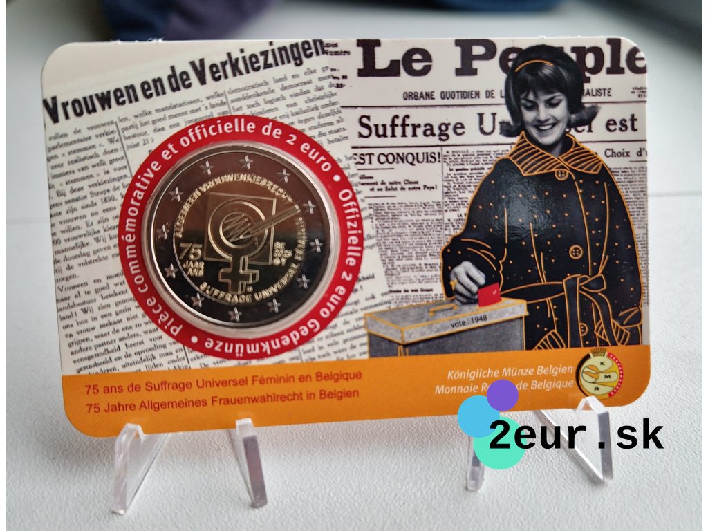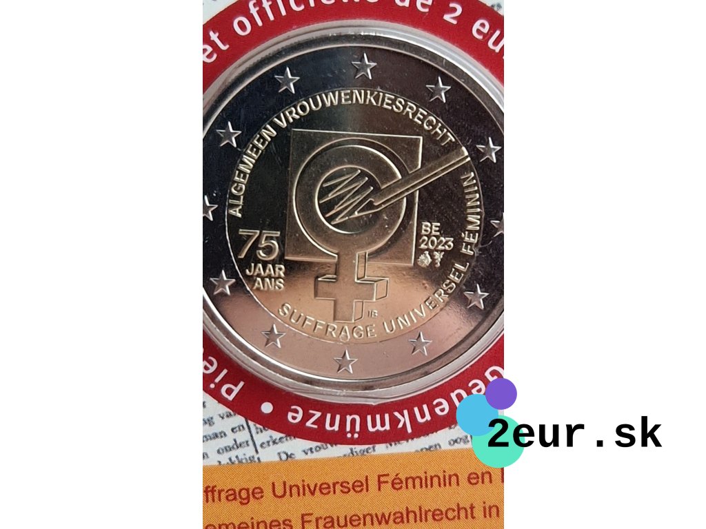 Belgická dvojeurová (2 eurová) minca z roku 2023 pripomína 75. výročie zavedenia všeobecného volebného práva pre ženy v Belgicku. Emisia oslavuje historický krok k rovnosti a posilneniu demokratických práv žien v krajine. Téma zdôrazňuje význam participácie žien v politickom a spoločenskom živote.