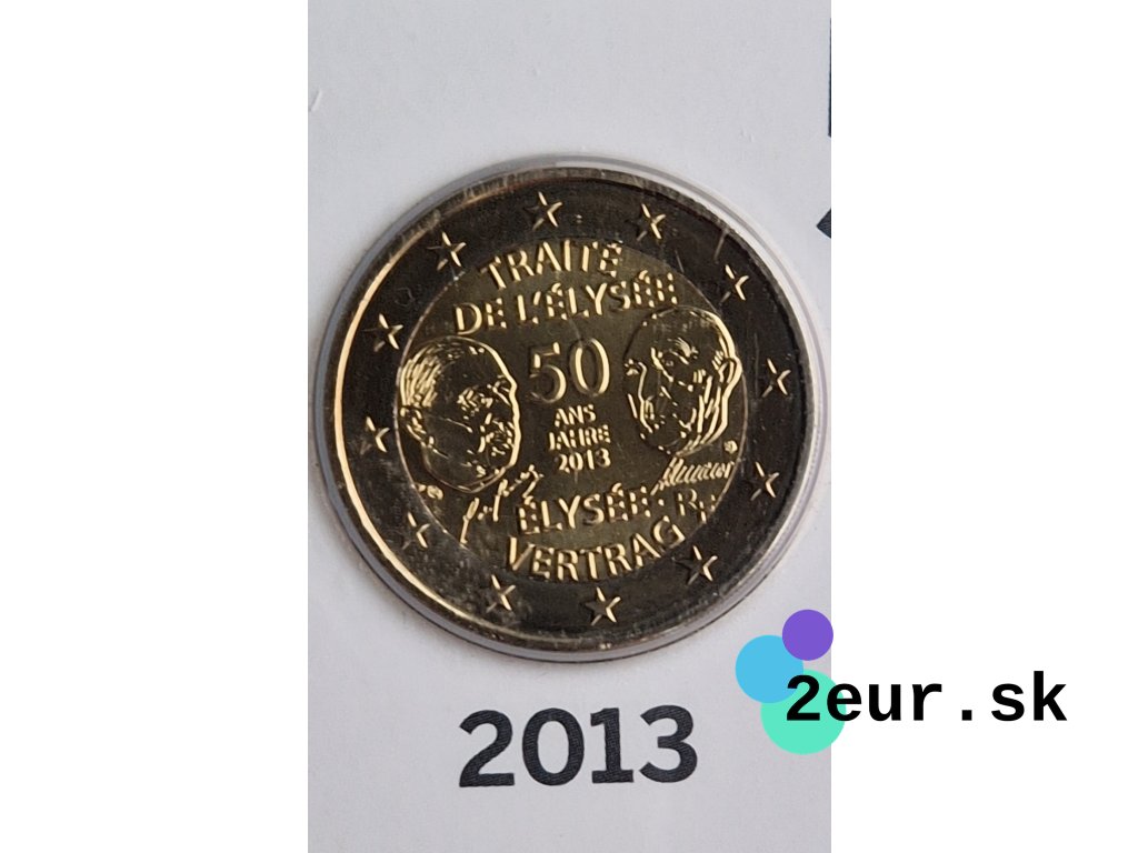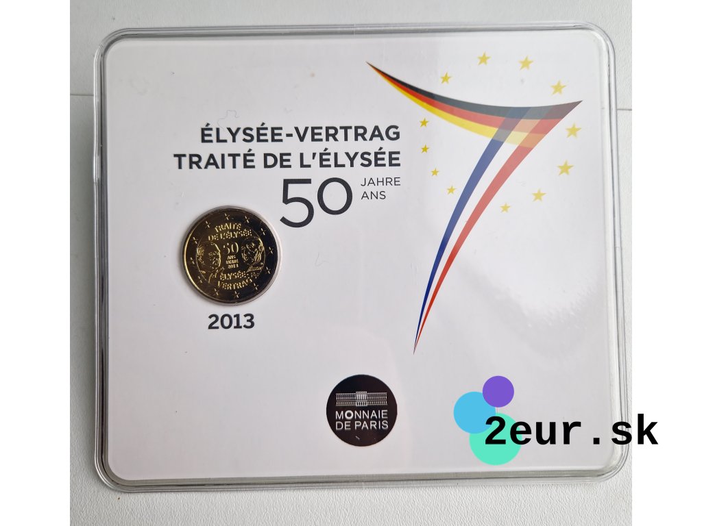 Francúzska dvojeurová (2 eurová) minca z roku 2013 pripomína 50. výročie Elyzejského zmluvy, ktorá upevnila spoluprácu medzi Francúzskom a Nemeckom. Motív mince zdôrazňuje význam tejto dohody pre mier a jednotu v Európe. Emisia podčiarkuje historický dopad Elyzejského zmluvy na politické a kultúrne vzťahy medzi oboma krajinami.