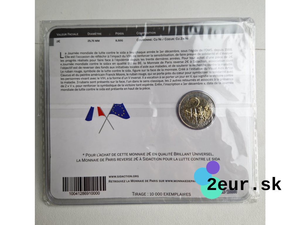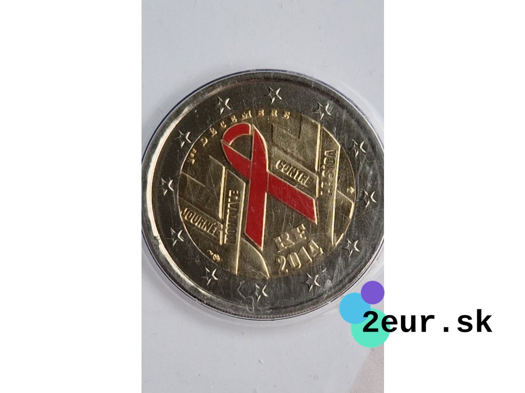Francúzska dvojeurová (2 eurová) minca z roku 2014 bola vydaná pri príležitosti Svetového dňa boja proti AIDS. Emisia pripomína dôležitosť osvety, solidarity a prevencie v boji proti tejto chorobe. Motív mince vyzdvihuje medzinárodnú spoluprácu a podporu verejného zdravia.