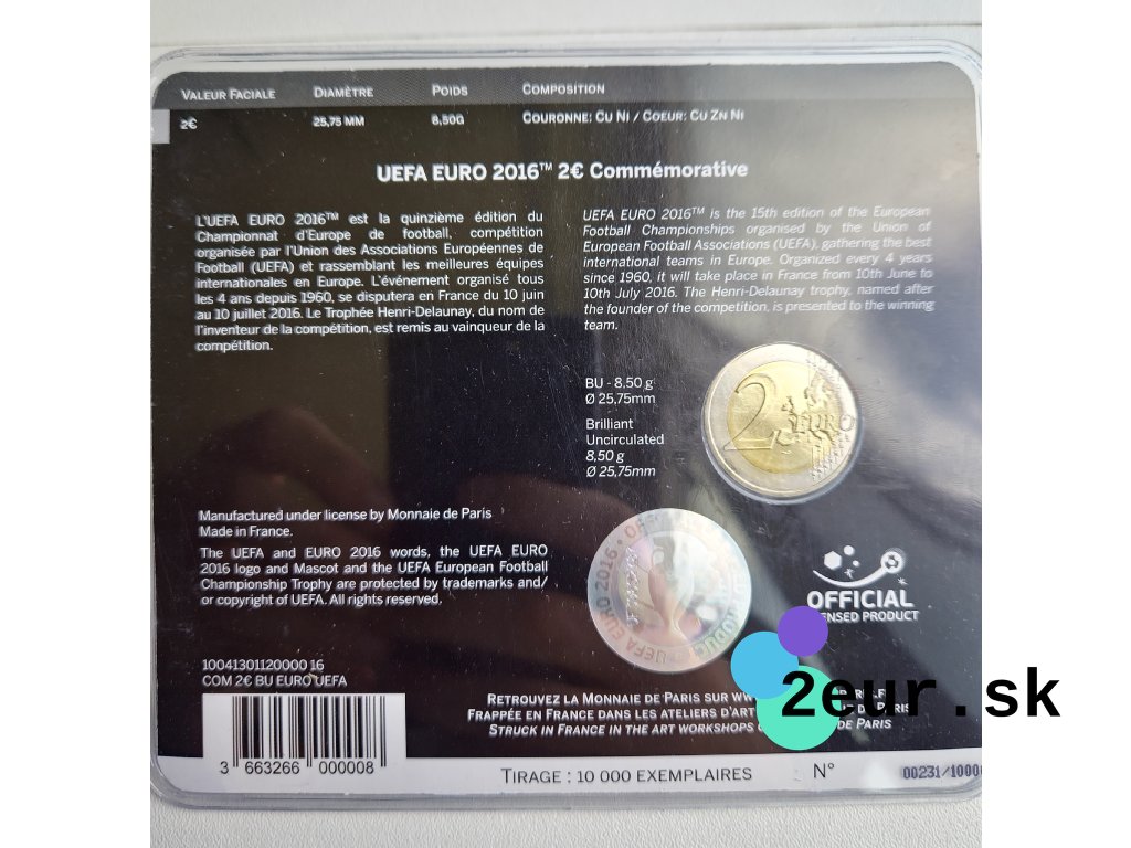 Francúzsko vydalo v roku 2016 pamätnú 2 eurovú mincu na počesť majstrovstiev Európy vo futbale UEFA EURO 2016, ktoré sa konali práve vo Francúzsku. Turnaj spojil fanúšikov z celého kontinentu a stal sa oslavou futbalu, športového ducha a priateľstva medzi národmi. Emisia mince symbolizuje športovú vášeň a jednotu, ktorú futbal prináša.