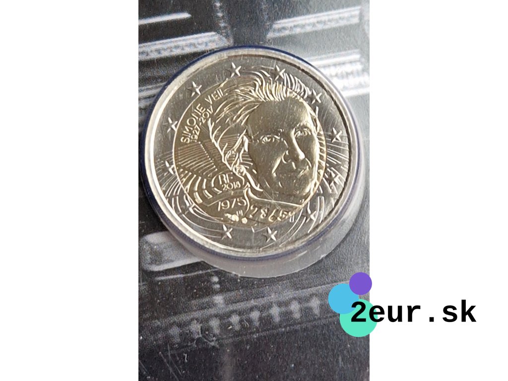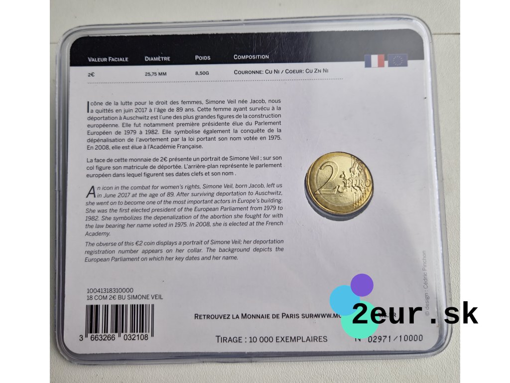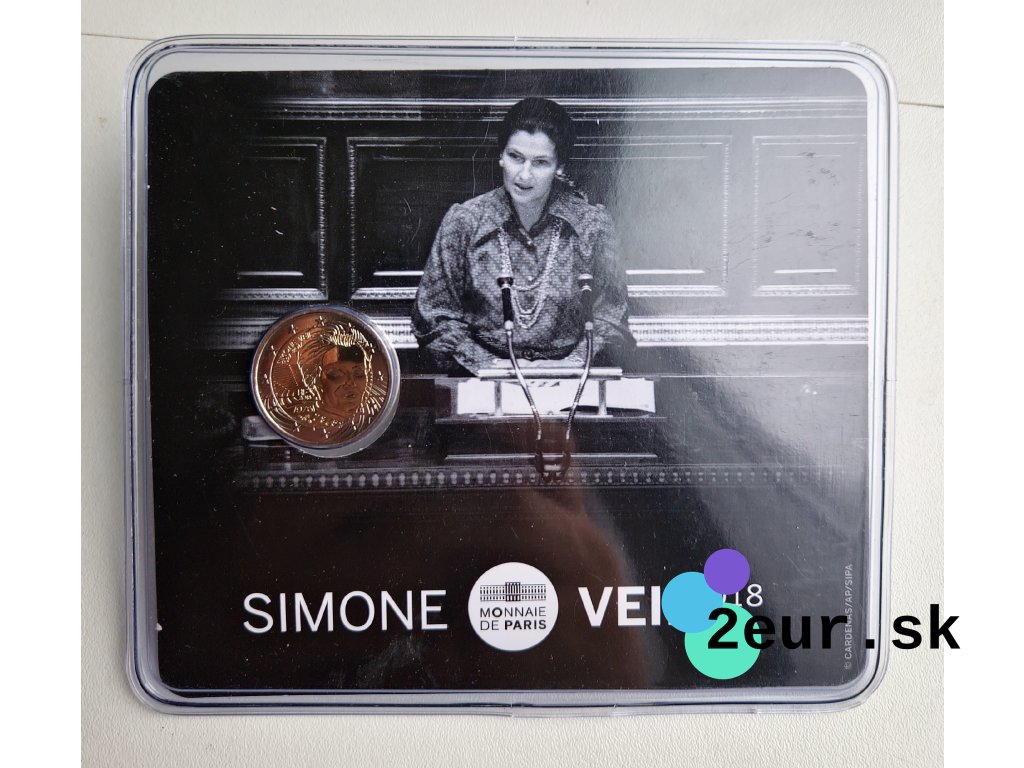 Francúzska dvojeurová (2 eurová) minca z roku 2018 vzdáva poctu Simone Veil, významnej političke a obhajkyni ľudských práv. Motív mince znázorňuje jej portrét a pripomína jej zásadný prínos v oblasti legislatívy a ochrany práv žien. Emisia vyzdvihuje odkaz Simone Veil a jej inšpiratívnu životnú cestu.