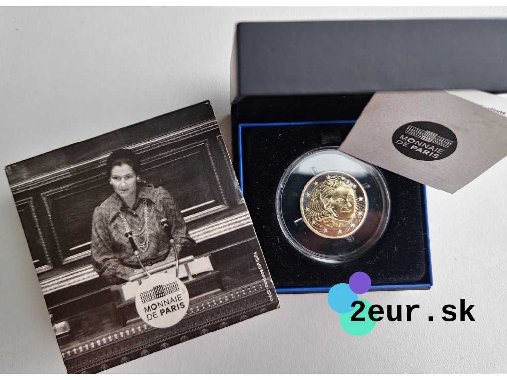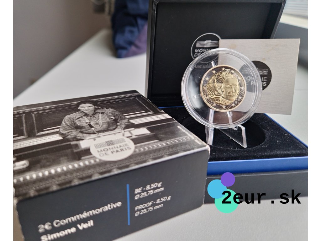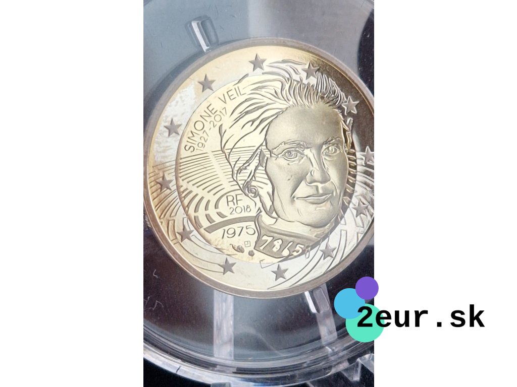 Francúzska dvojeurová (2 eurová) minca z roku 2018 vzdáva hold Simone Veil, významnej političke a obhajkyni ľudských práv. Motív mince zobrazuje jej portrét a pripomína jej zásadný prínos v oblasti legislatívy a ochrany práv žien vo Francúzsku aj Európe. Emisia vyzdvihuje jej odkaz a inšpiratívnu životnú dráhu.