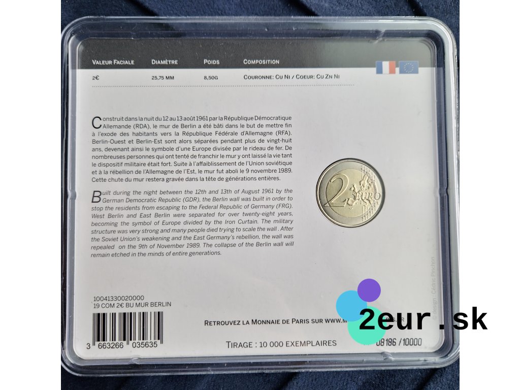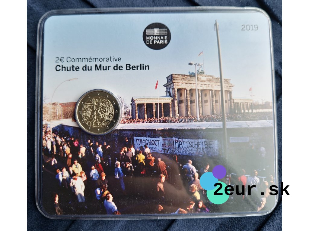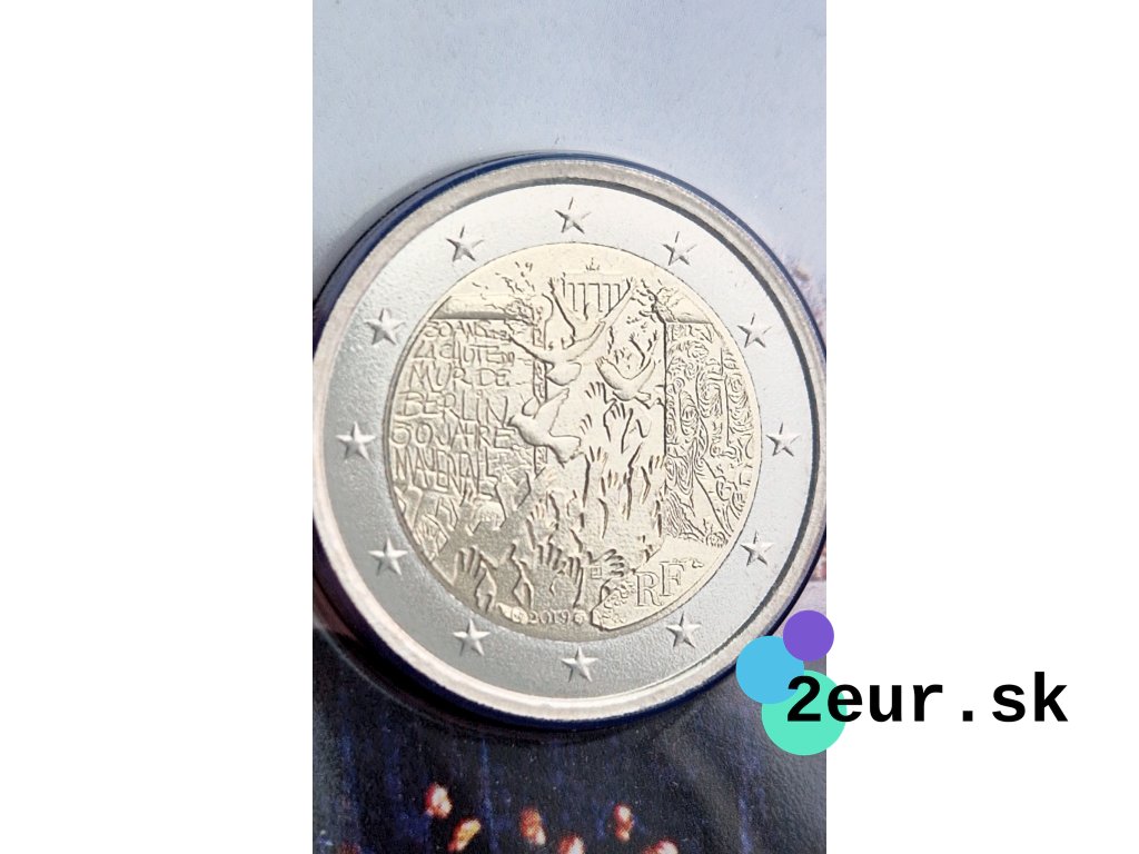 Francúzska dvojeurová minca z roku 2019 pripomína 30. výročie pádu Berlínskeho múra, ktorý symbolizoval koniec rozdelenia Európy. Motív mince zobrazuje rozpadávajúci sa múr s nápisom „30 ans de la chute du Mur de Berlin“, čím zdôrazňuje historický moment znovuzjednotenia. Tento dizajn vyjadruje posolstvo slobody a prekonania hraníc.