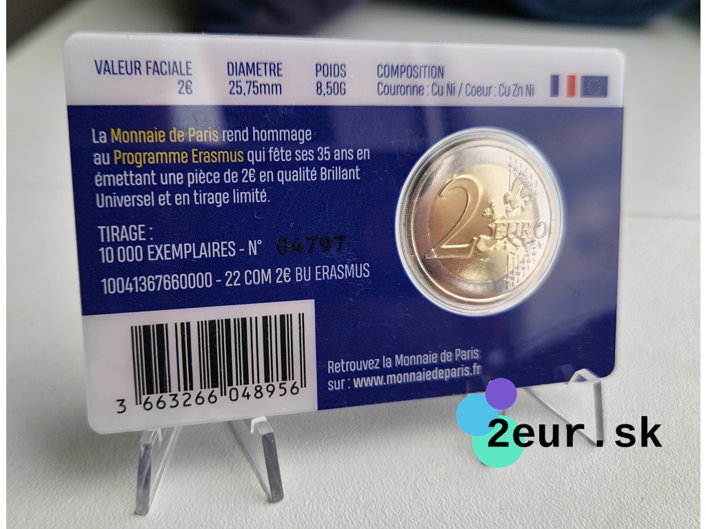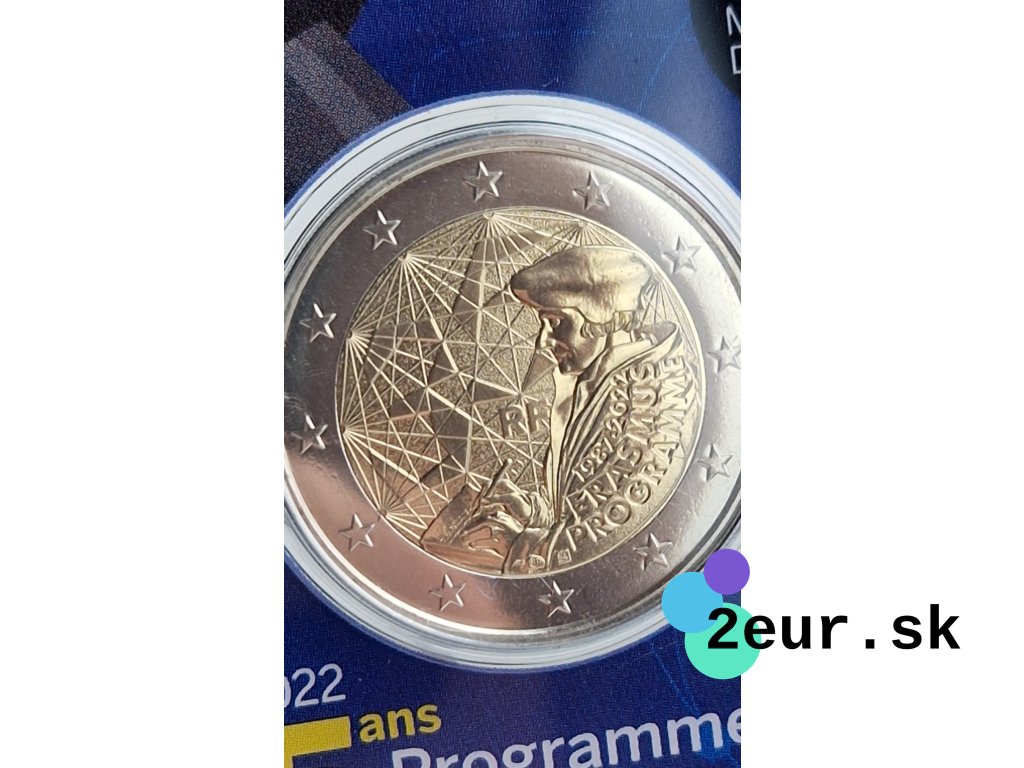 Francúzska dvojeurová (2 eurová) minca z roku 2022 pripomína 35. výročie vzniku programu Erasmus, ktorý otvoril miliónom mladých Európanov možnosť študovať a získať skúsenosti v zahraničí. Na minci je vyjadrená symbolika vzdelávania, kultúrnej výmeny a myšlienky jednotnej Európy, ktorú Erasmus program podporuje už celé desaťročia. Ide o pripomienku významného míľnika, ktorý prepojil generácie študentov a prispel k budovaniu európskej identity.