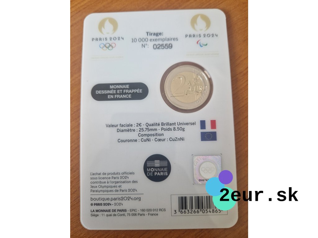 Francúzsko vydalo 2 eurovú mincu k Olympijským a Paralympijským hrám v Paríži 2024, ktoré patrili medzi najväčšie športové udalosti desaťročia. Podujatie zdôrazňovalo hodnoty fair play, medzinárodnej spolupráce a radosti z pohybu. Minca nesie motív hier a predstavuje pripomienku ich výnimočného významu pre hostiteľskú krajinu aj celý svet.