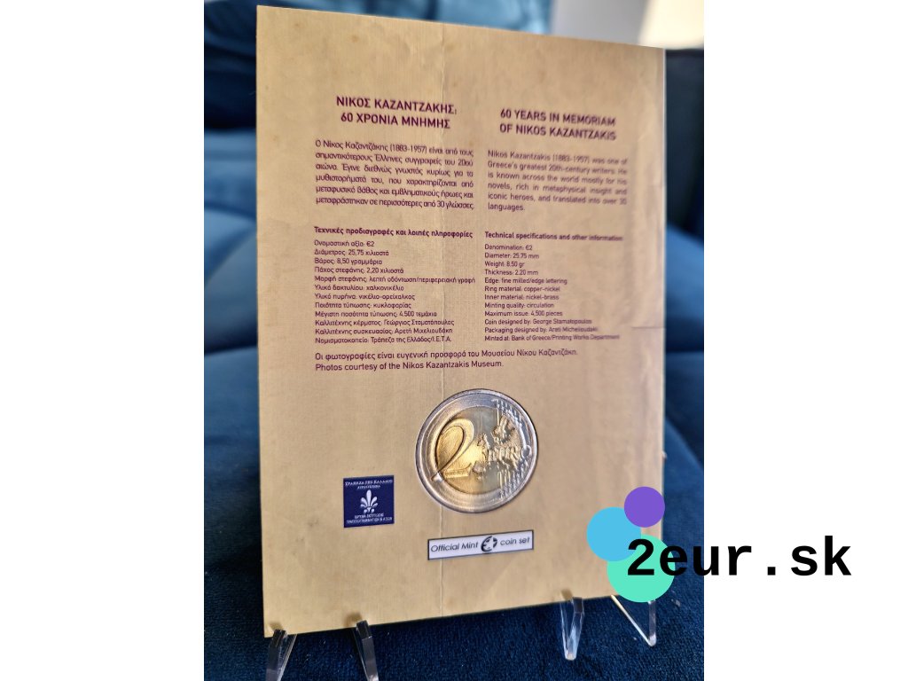 V roku 2017 si Grécko pripomenulo 60. výročie úmrtia svetoznámeho spisovateľa Nikosa Kazantzakisa, autora nesmrteľných diel ako Alexis Zorbas. Jeho tvorba presiahla hranice literatúry a stala sa symbolom filozofických otázok o slobode, viere a ľudskom osude. Minca venovaná tejto významnej osobnosti pripomína jeho kultúrny odkaz a miesto v dejinách gréckej i svetovej literatúry.