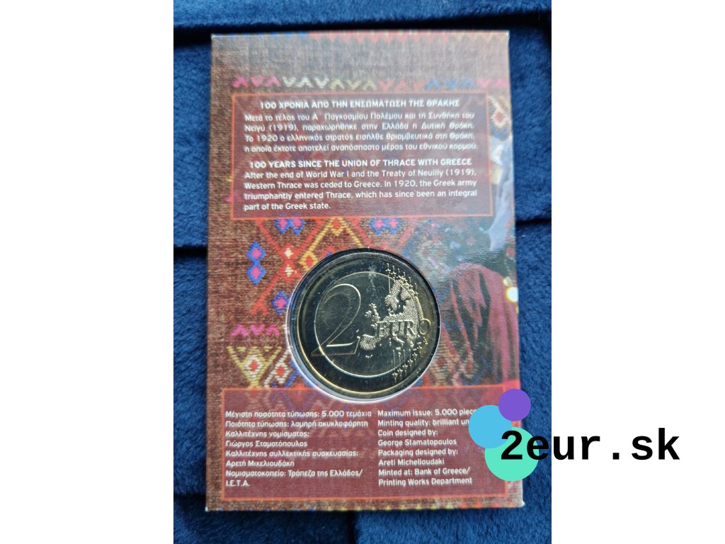 Oslava 100. výročia zjednotenia Trácie s Gréckom v roku 2020 je významnou udalosťou, ktorá pripomína pripojenie tejto oblasti k gréckemu národu po stáročiach osmanskej nadvlády. Trácia, ako dôležitý historický a kultúrny región, získala svoje miesto v modernom Grécku, čo je dôvodom na oslavy a reflexiu. Grécka 2-eurová minca, vydaná pri príležitosti tohto výročia, je k dispozícii v kvalite BU, starostlivo uložená v pamätnej karte.