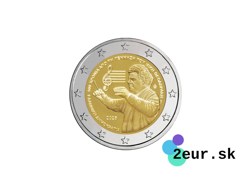 Grécko v roku 2025 pripomína 100. výročie narodenia Mikisa Theodorakisa, jedného z najznámejších gréckych skladateľov a kultúrnych osobností 20. storočia. Jeho hudba sa stala symbolom slobody a odporu, preslávil sa dielami ako „Zorba the Greek“ či tvorbou filmovej a symfonickej hudby. Minca zdôrazňuje význam jeho odkazu pre grécku kultúru a modernú históriu.