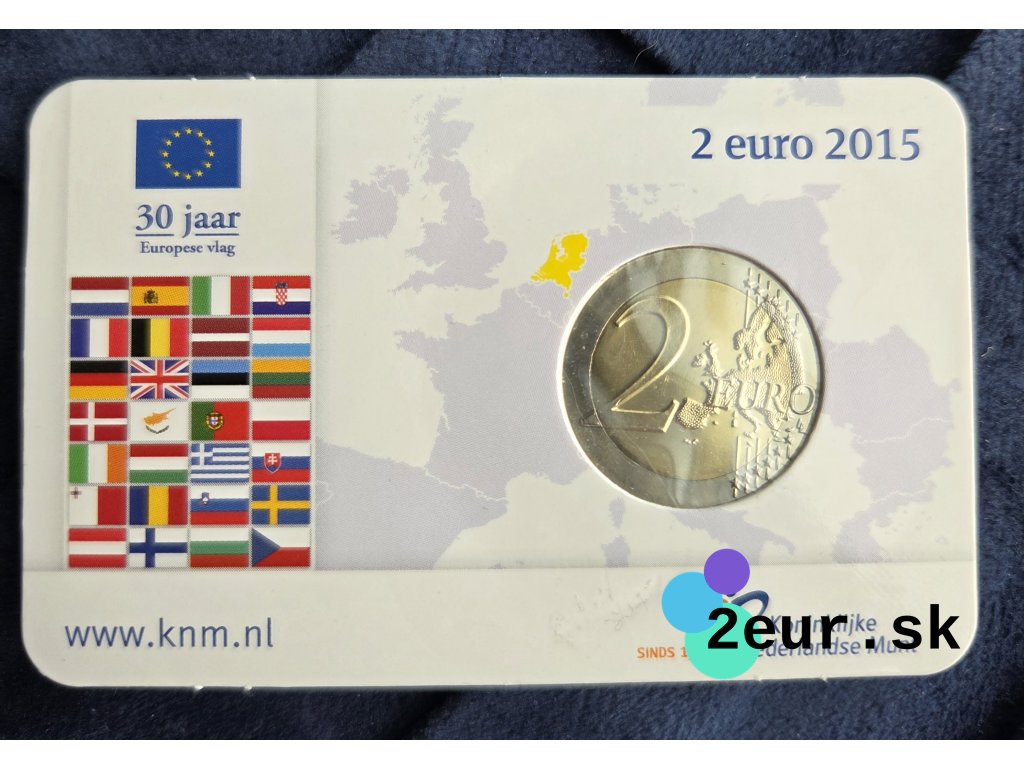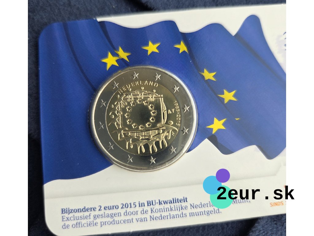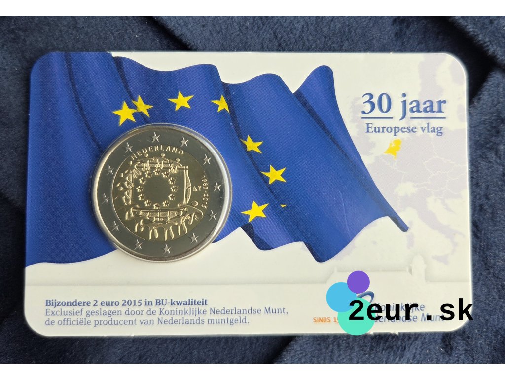 Holandská dvojeurová minca z roku 2015 bola vydaná pri príležitosti 30. výročia európskej vlajky, ktorá symbolizuje jednotu a spoluprácu krajín Európskej únie. Motív mince znázorňuje kruh dvanástich hviezd postupne sa premieňajúcich na skutočnú vlajku EÚ, čo vyjadruje myšlienku európskej integrácie. Tento dizajn oslavuje hodnoty solidarity, mieru a stability v Európe.
