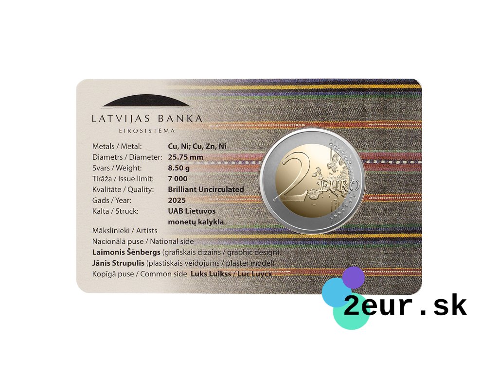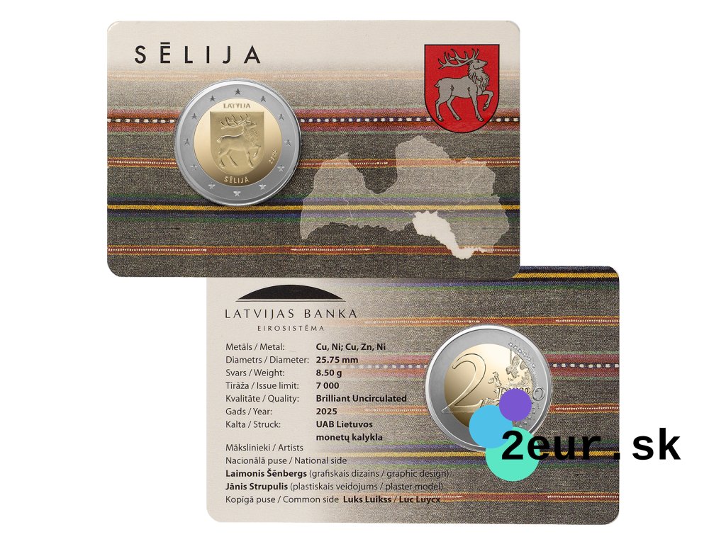 Lotyšsko v roku 2025 vydalo 2 eurovú pamätnú mincu venovanú regiónu Selija, jednej z historických oblastí krajiny. Téma zdôrazňovala kultúrnu identitu, tradície a regionálne dedičstvo, ktoré formovali dejiny juhovýchodného Lotyšska. Emisia pripomínala význam miestnej histórie v rámci národného kultúrneho obrazu. Minca bola v kvalite razby BU a bola dodaná v oficiálnej pamätnej karte.