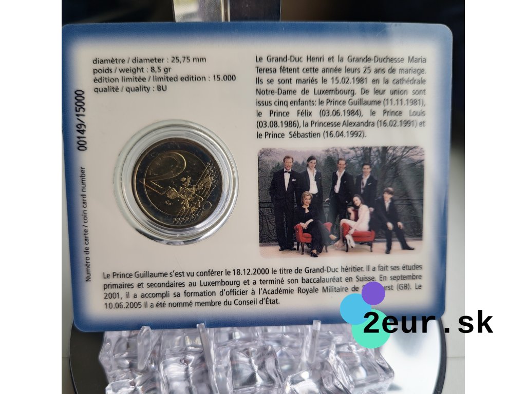 2 eurová minca Luxembursko 2006 „25. narodeniny dedičného veľkovojvodu Guillauma“ vychádza ako oficiálna emisia Luxemburska. Pripomína míľnik života nástupcu trónu, syna veľkovojvodu Henricha, a jeho úlohu v reprezentácii krajiny. Zdôrazňuje kontinuitu rodu Nassau-Weilburg a miesto monarchie v ústavnom usporiadaní Luxemburska.