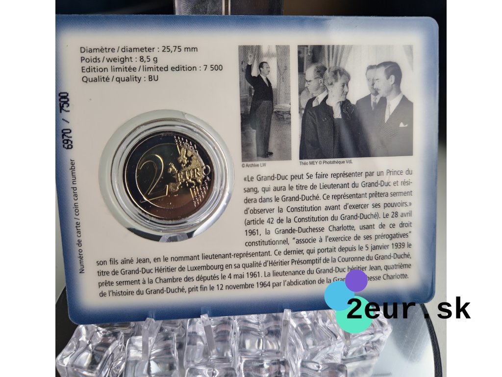 Luxembursko v roku 2011 vydalo 2-eurovú mincu na počesť 50. výročia vymenovania veľkovojvodu Jeana za zastupujúceho veľkovojvodu (lieutenant-représentant). Minca zobrazuje portréty veľkovojvodu Jeana a jeho matky, veľkovojvodkyne Charlotty, pripomínajúc dôležitý okamih v luxemburskej histórii. Tento historický moment zdôrazňuje prechod zodpovednosti v rámci veľkovojvodskej rodiny. Minca je dostupná v kvalite BU a prezentovaná v pamätnej karte.