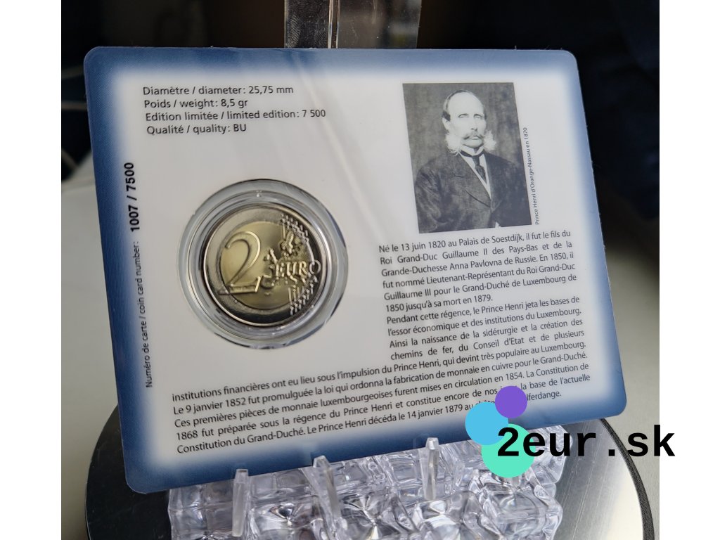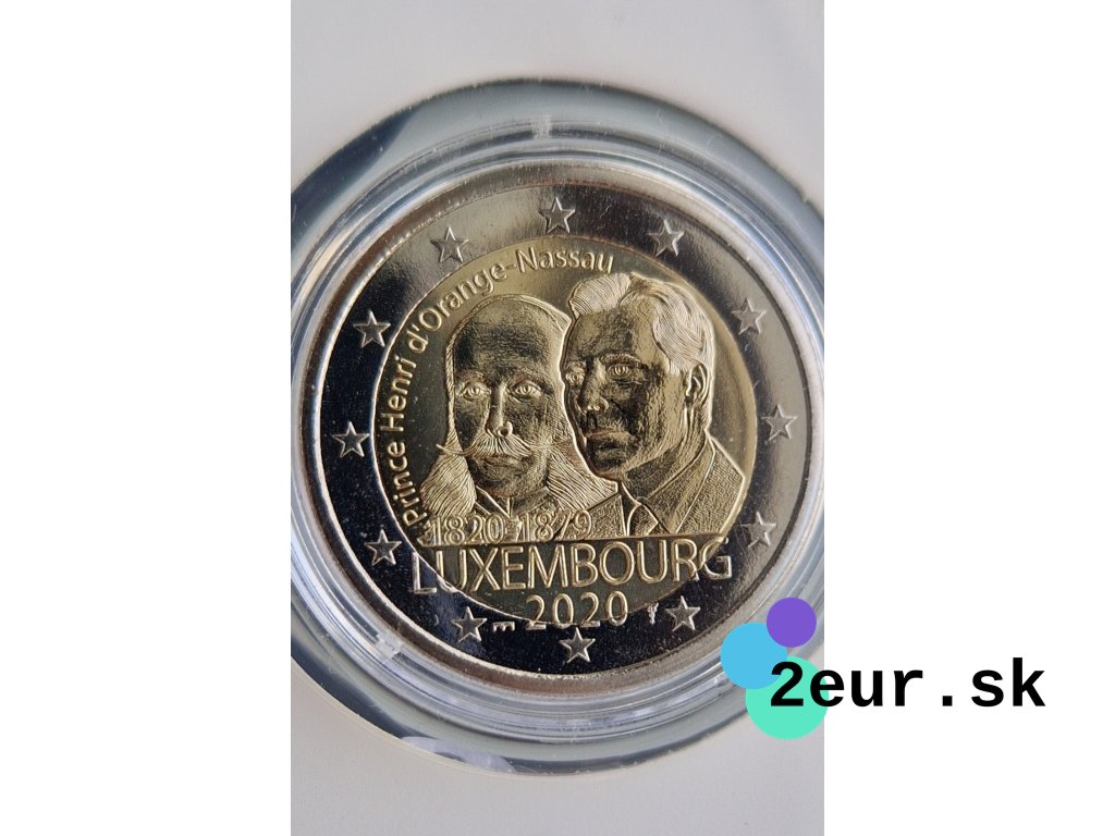 2 eurová minca Luxembursko 2020 - „200. výročie narodenia princa Henriho z rodu Orange-Nassau“ sa dodáva v oficiálnej karte. Emisia pripomína princa Henriho (1820–1879), brata holandského kráľa a dlhoročného guvernéra Luxemburska v období personálnej únie s Holandskom. Téma zvýrazňuje historické väzby Luxemburska na dynastiu Nassau-Weilburg a modernizačné zmeny 19. storočia.