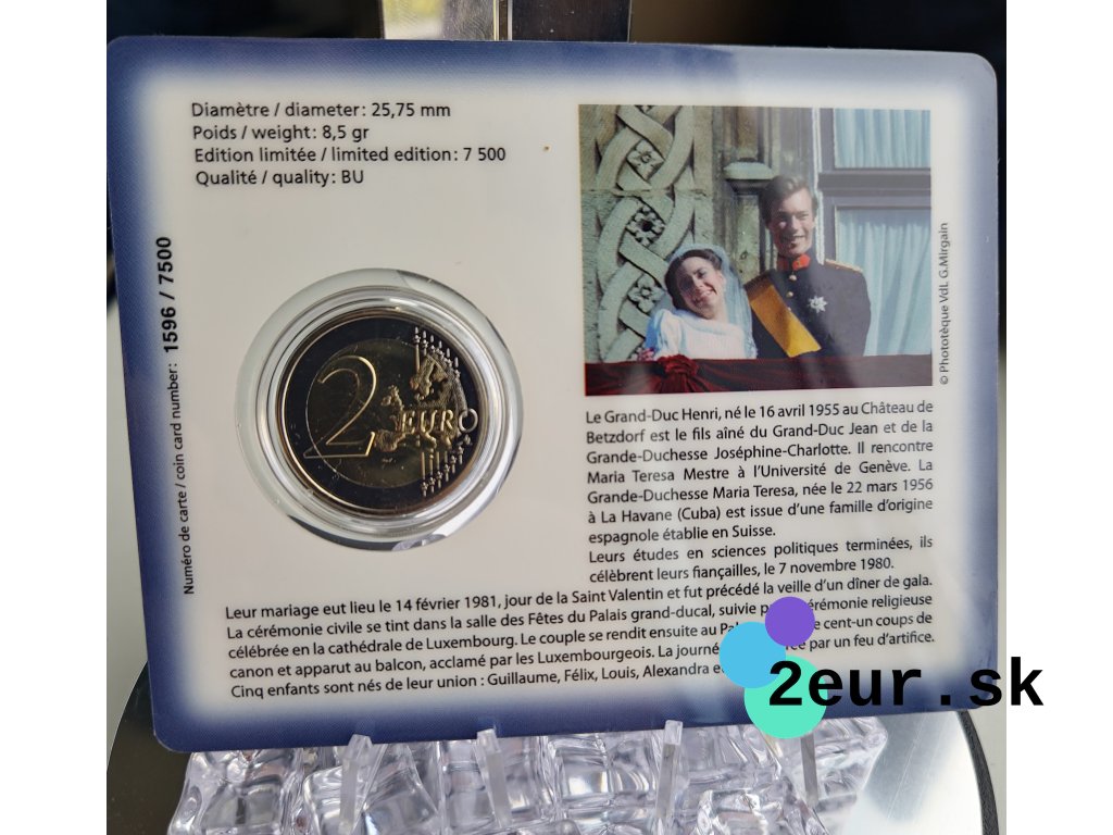 Krajina: Luxembursko • Rok: 2021 • Kvalita: BU • Téma: 40. výročie sobáša veľkovojvodkyne Maria Teresy a veľkovojvodu Henricha • Balenie: oficiálna karta • Náklad: 7 500 ks • Mincovné značky: Servaas Bridge / Caduceus