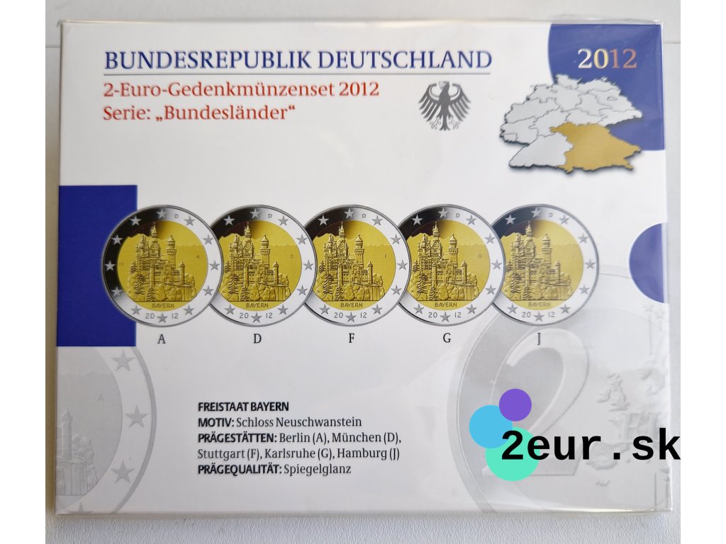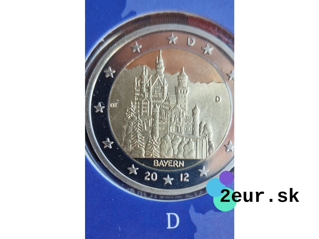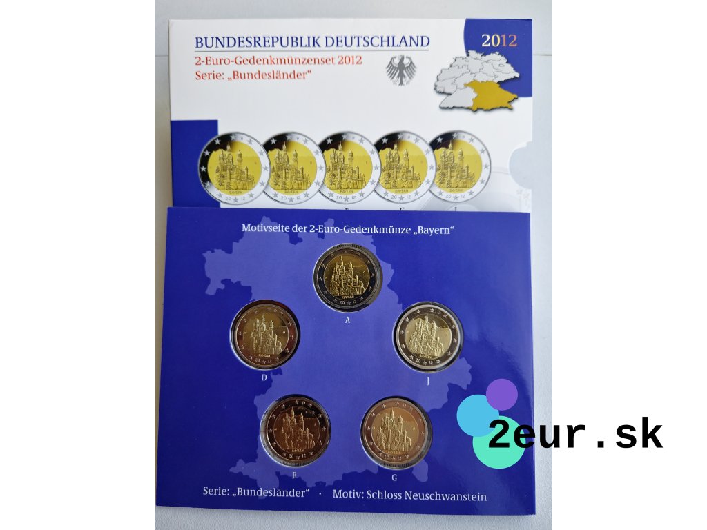 Krajina: Nemecko • Rok: 2012 • Kvalita: Proof • Téma: Bavorsko – Zámok Neuschwanstein • Sada: 5 × 2 eurová minca (A/D/F/G/J) • Náklad: 55 000 ks.
