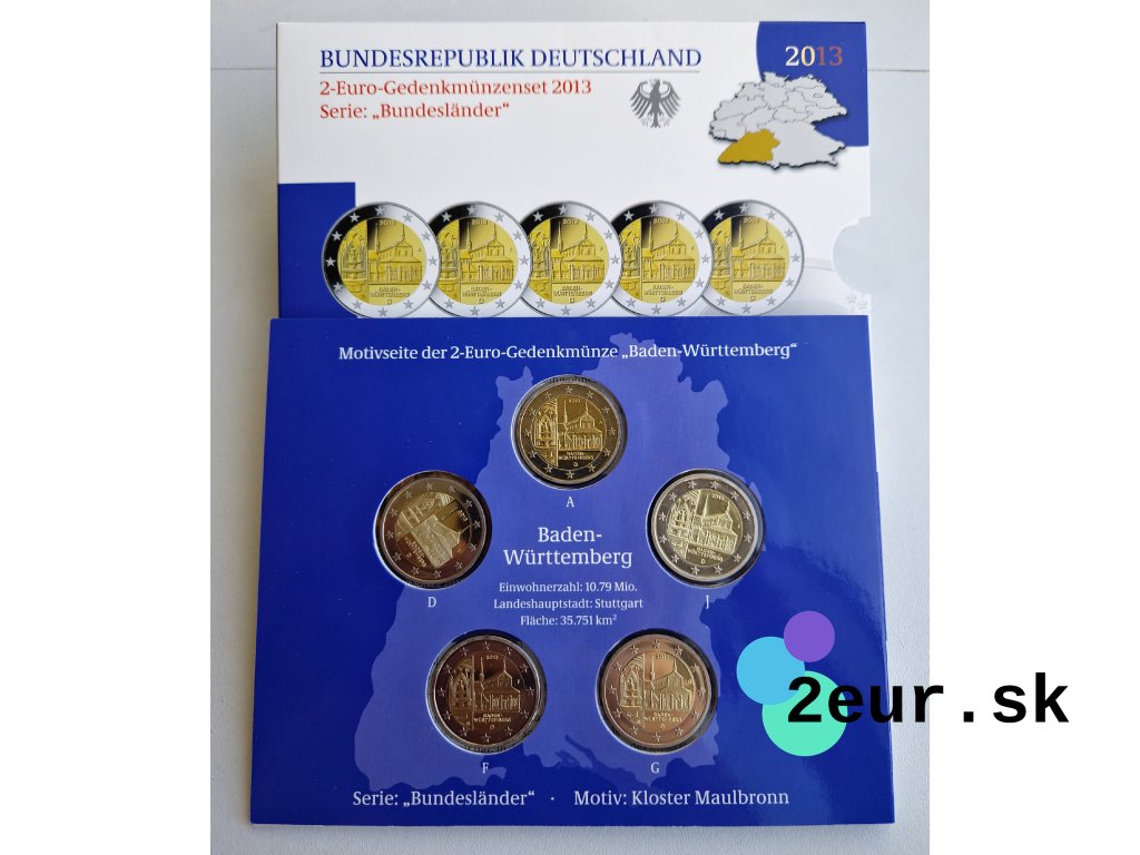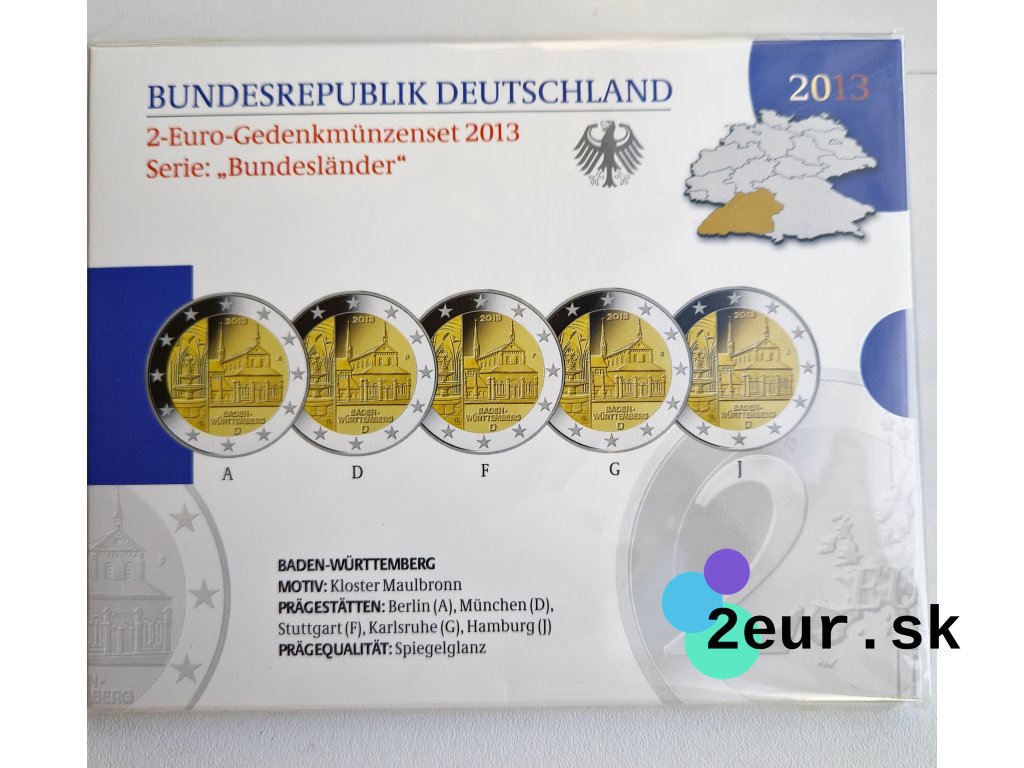 Krajina: Nemecko • Rok: 2013 • Kvalita: Proof • Téma: Bádensko-Württembersko – Kláštor Maulbronn • Sada: 5 × 2 eurová minca (A/D/F/G/J) • Mincovne: Berlín (A), Mníchov (D), Stuttgart (F), Karlsruhe (G), Hamburg (J) • Náklad: 50 000 ks.