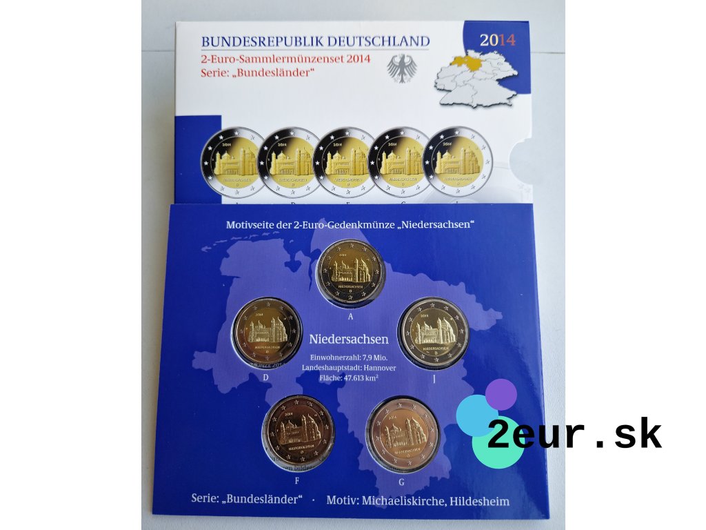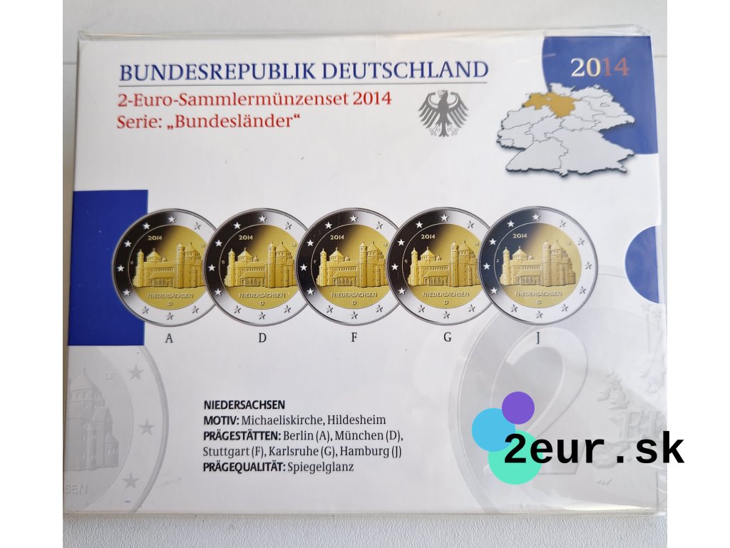 Krajina: Nemecko • Rok: 2014 • Kvalita: Proof • Téma: Dolné Sasko – Kostol sv. Michala (Hildesheim) • Sada: 5 × 2 eurová minca (A/D/F/G/J) • Mincovne: Berlín (A), Mníchov (D), Stuttgart (F), Karlsruhe (G), Hamburg (J) • Náklad: 50 000 ks.