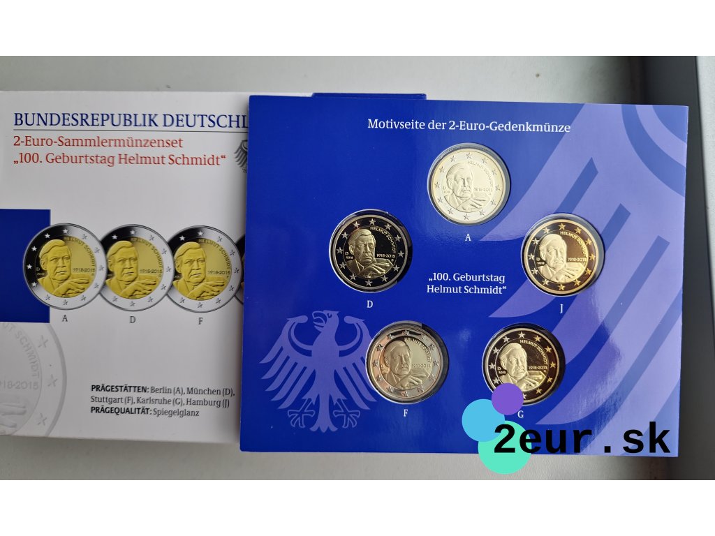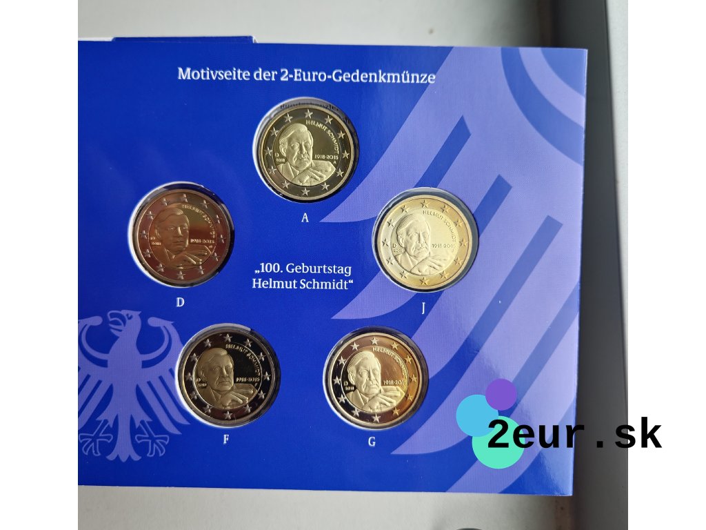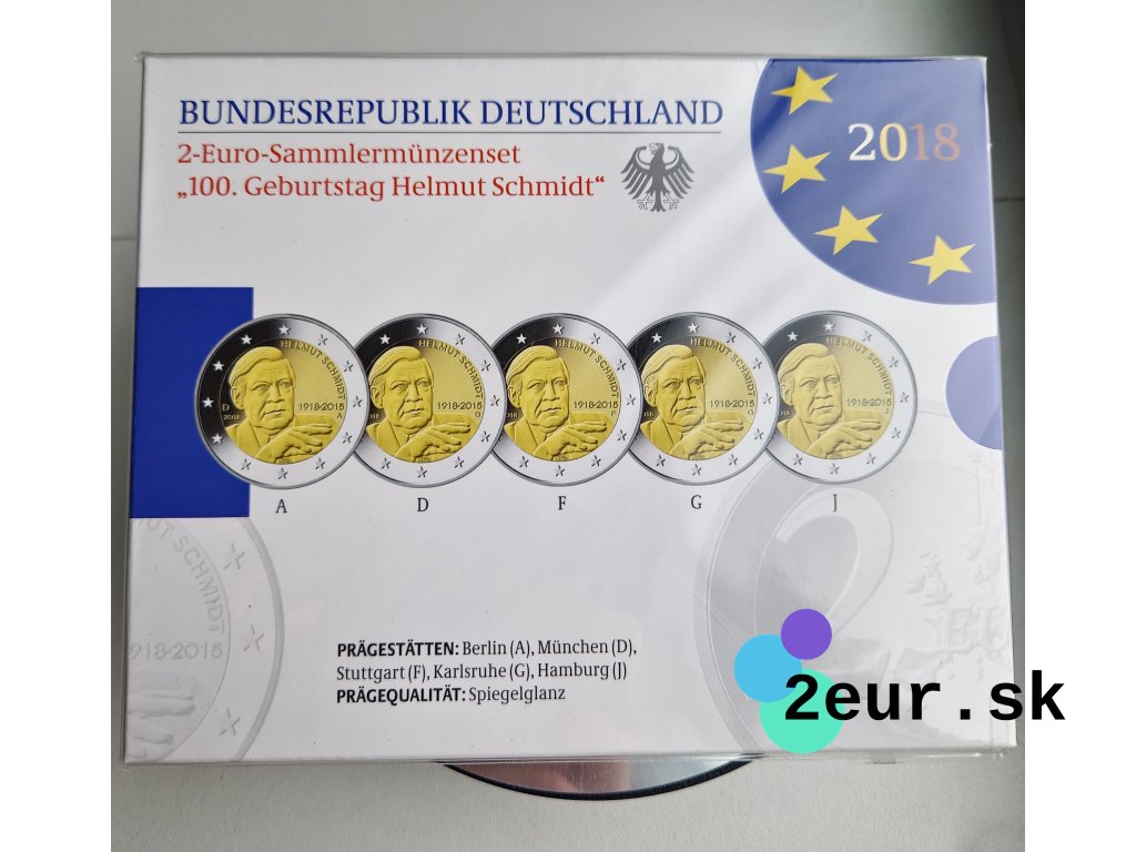Krajina: Nemecko • Rok: 2018 • Kvalita: Proof-Like (PF) • Téma: 100. narodeniny Helmuta Schmidta • Sada: 5 × 2 € (A/D/F/G/J) • Mincovne: Berlín (A), Mníchov (D), Stuttgart (F), Karlsruhe (G), Hamburg (J) • Náklad: 40 000 ks.