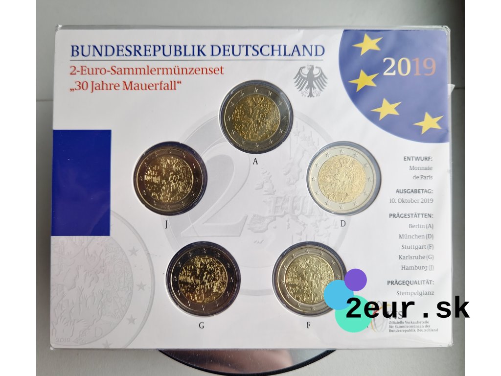 Krajina: Nemecko • Rok: 2019 • Kvalita: BU • Téma: 30 rokov od pádu Berlínskeho múru • Sada: 5 × 2 € (A/D/F/G/J) • Mincovne: Berlín (A), Mníchov (D), Stuttgart (F), Karlsruhe (G), Hamburg (J) • Náklad: 26 400 ks.