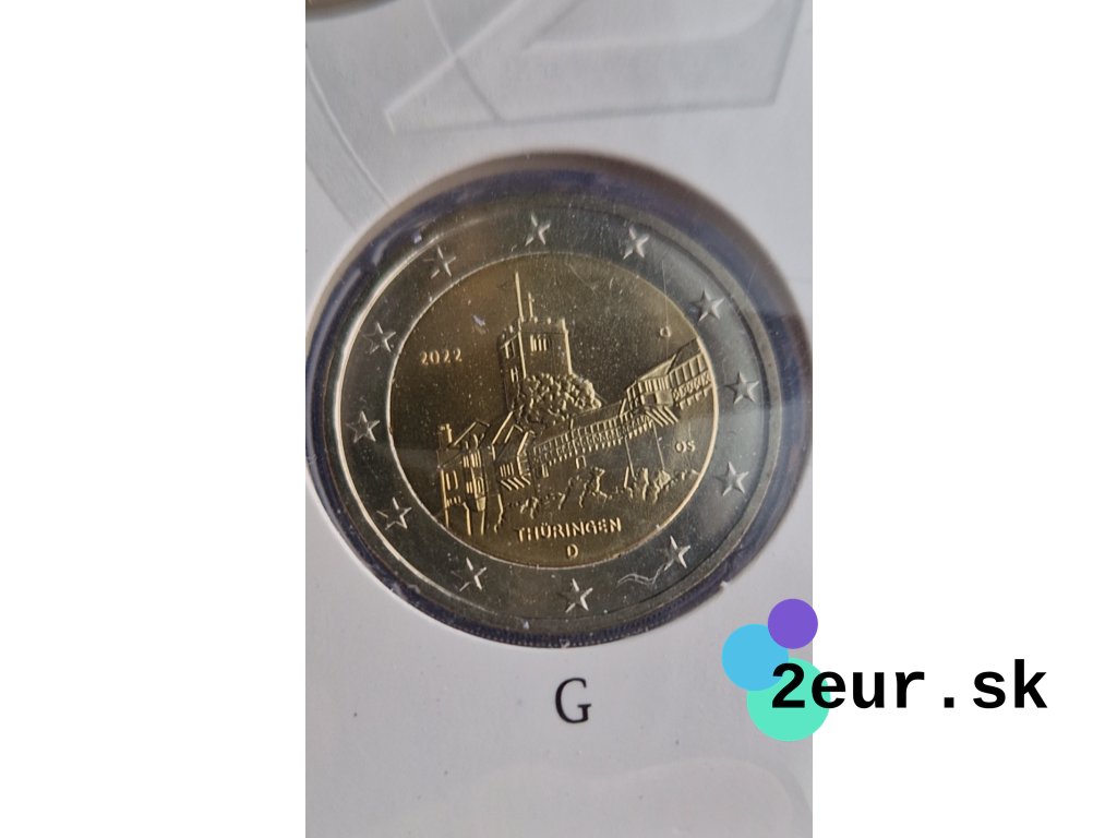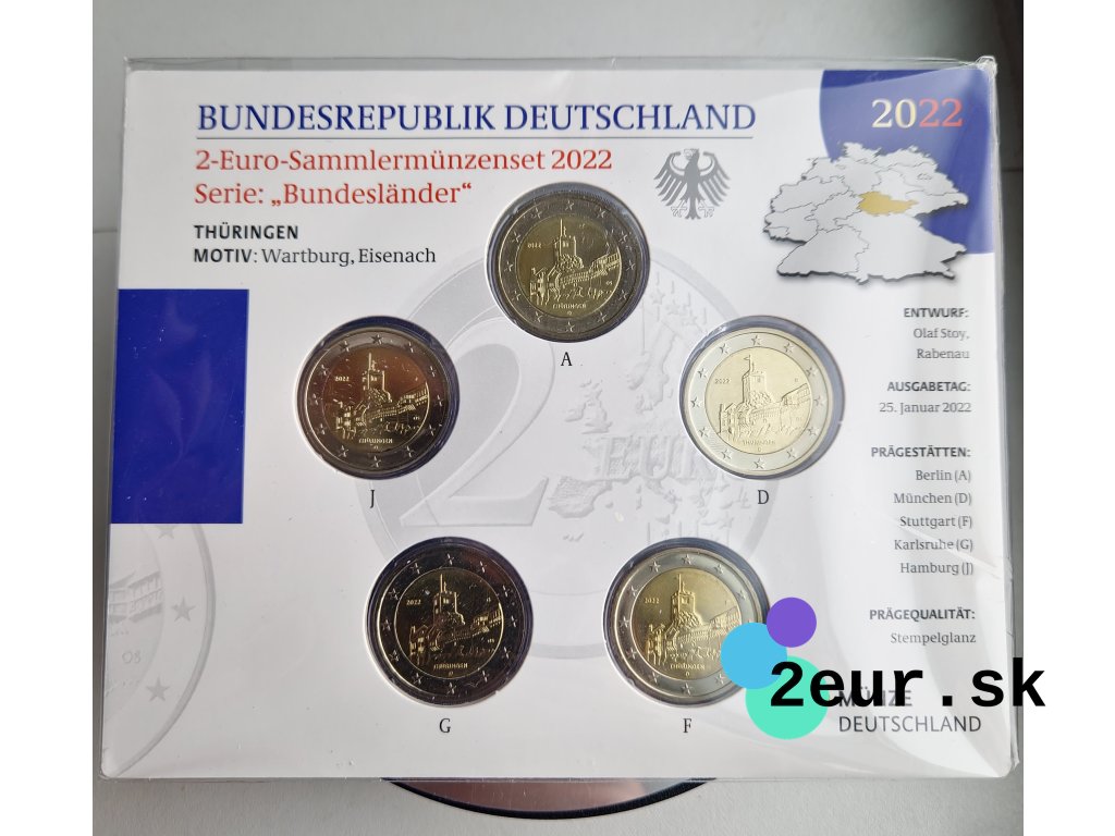 Krajina: Nemecko • Rok: 2022 • Kvalita: BU • Téma: Durínsko – hrad Wartburg • Sada: 5 × 2 € (A/D/F/G/J) • Mincovne: Berlín (A), Mníchov (D), Stuttgart (F), Karlsruhe (G), Hamburg (J).