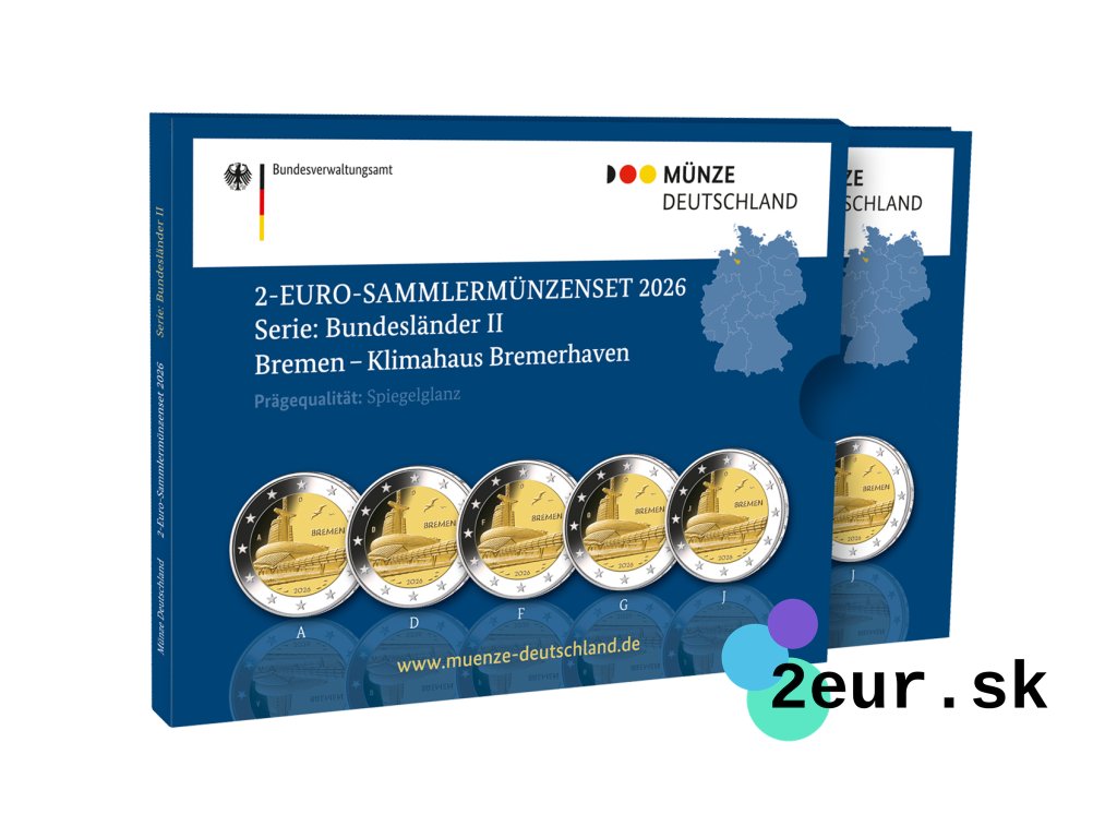 Krajina: Nemecko • Rok: 2026 • Séria: Spolkové krajiny II – Brémy (Klimahaus Bremerhaven) • Kvalita: Proof • Sada: 5 × 2 € (A/D/F/G/J) • Mincovne: Berlín (A), Mníchov (D), Stuttgart (F), Karlsruhe (G), Hamburg (J) • Náklad: 17 500 ks.