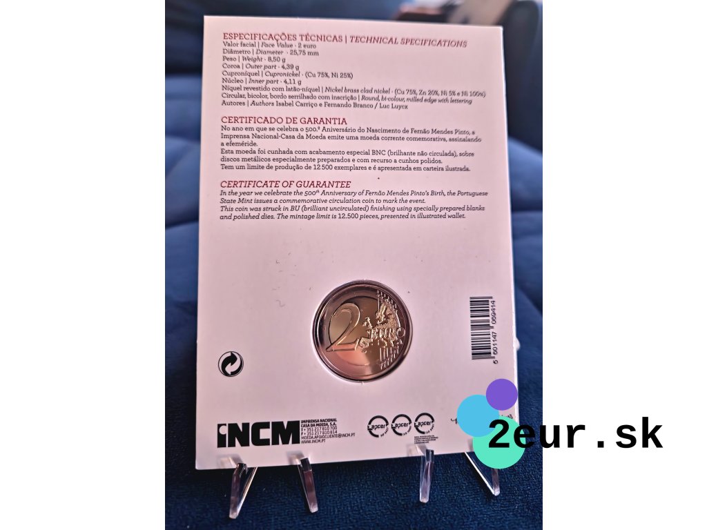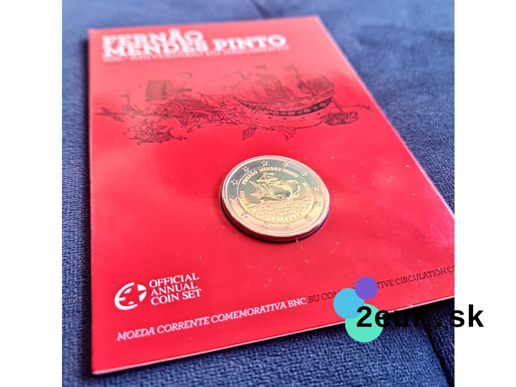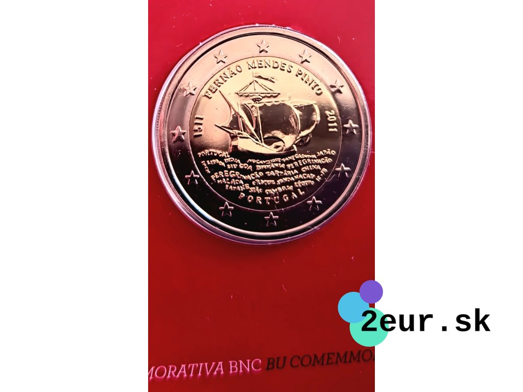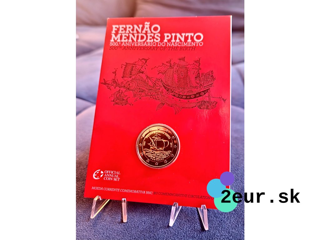 2 eurová minca Portugalsko 2011 „500. výročie narodenia Fernãa Mendesa Pinta“ vychádza v kvalite BU a dodáva sa v oficiálnej karte. Fernão Mendes Pinto patrí medzi najznámejších portugalských cestovateľov a autorov; v diele Peregrinação opisuje svoje cesty po Ázii v 16. storočí. Emisia pripomína éru portugalských objavov a kultúrne prepojenia medzi Európou a Áziou.