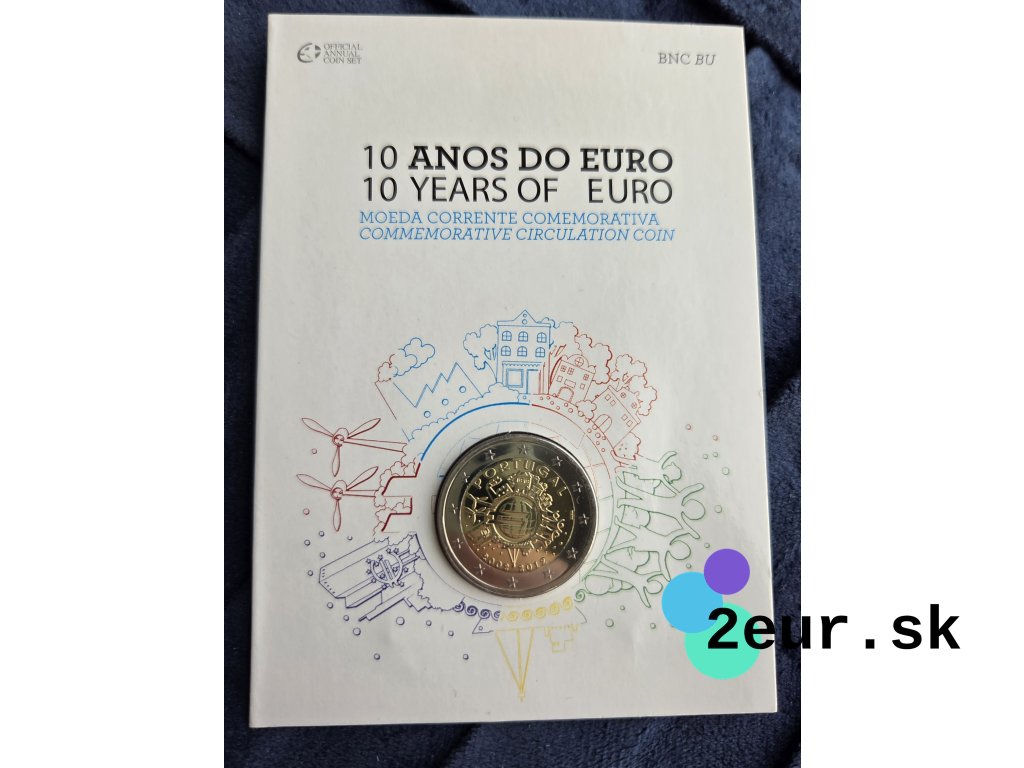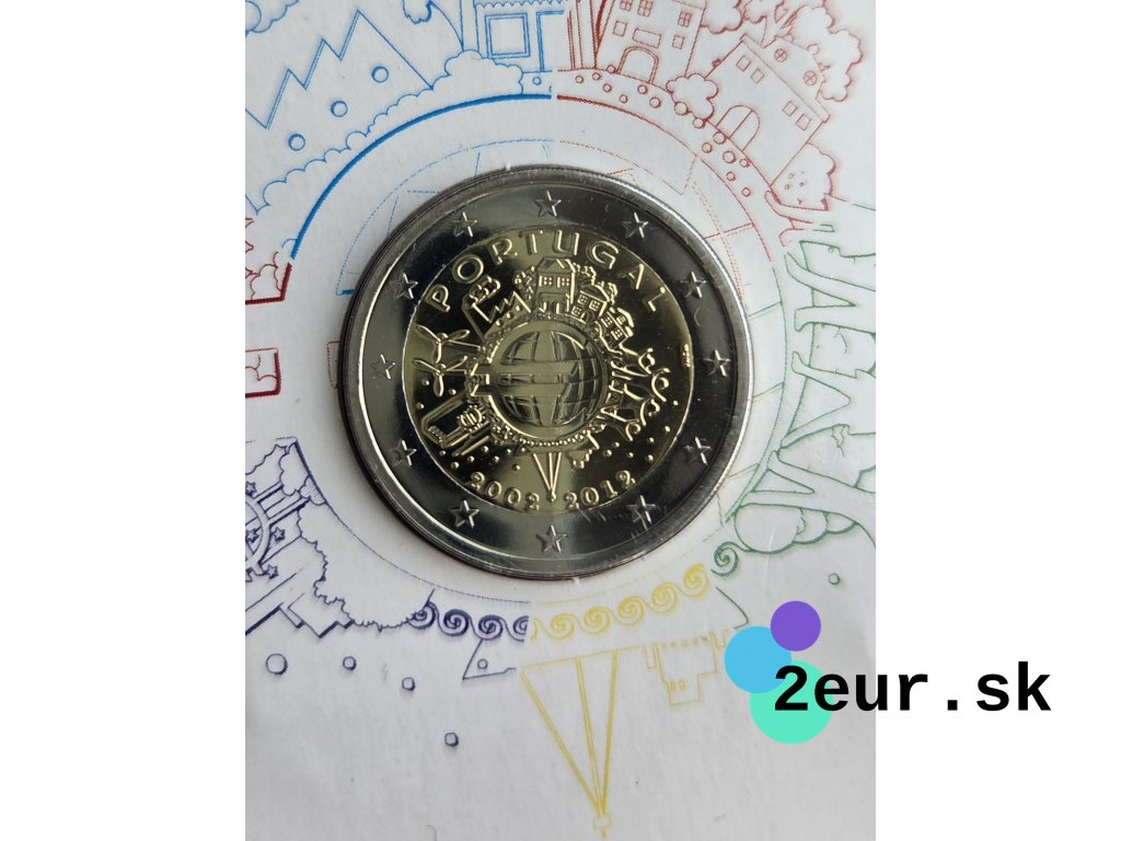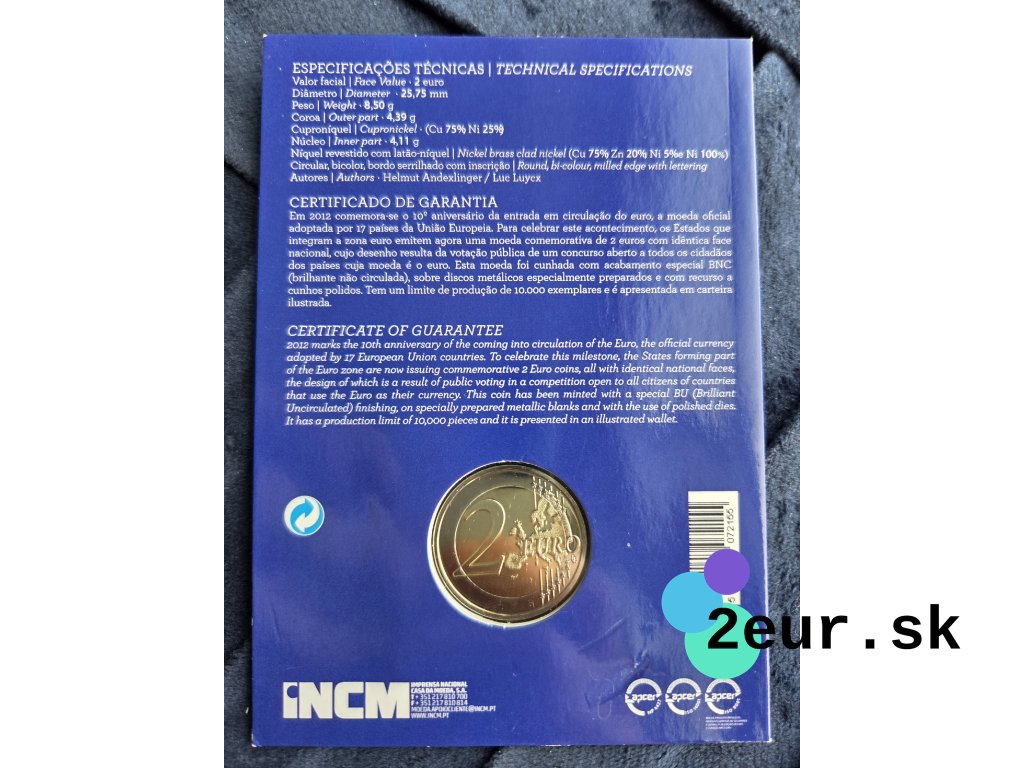 Portugalská dvojeurová minca z roku 2012 bola vydaná pri príležitosti 10. výročia zavedenia eura, ktoré zohralo zásadnú úlohu v hospodárskom zjednotení Európy. Motív mince zobrazuje symboly stability a ekonomického rastu, pričom centrálne prvky dizajnu odkazujú na význam spoločnej meny pre európske krajiny. Euro sa za desaťročie svojej existencie stalo neoddeliteľnou súčasťou každodenného života miliónov ľudí.