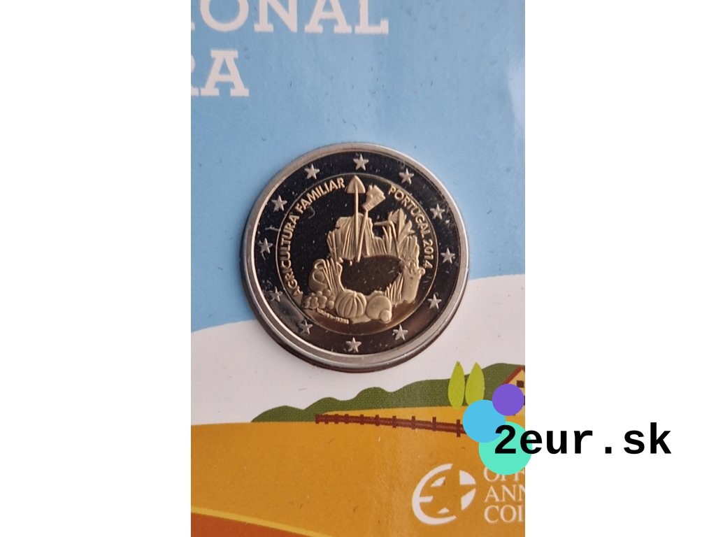2 eurová minca Portugalsko 2014 „Medzinárodný rok rodinných fariem“ vychádza vo verzii Proof a dodáva sa v oficiálnom balení. Rodinné farmy tvoria základ vidieka; rok 2014 OSN vyhlasuje za IYFF na podporu udržateľného hospodárenia, potravinovej bezpečnosti a rozvoja komunít. Emisia zvýrazňuje poľnohospodársku tradíciu Portugalska a úlohu malých hospodárstiev.