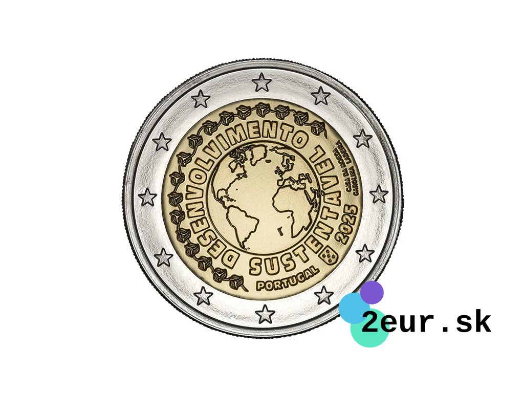 Portugalsko vydalo v roku 2025 pamätnú 2 eurovú mincu venovanú udržateľnému rozvoju, ktorá pripomína potrebu rovnováhy medzi ochranou prírody, hospodárskym rastom a sociálnou spravodlivosťou. Téma vyzdvihuje zodpovednosť jednotlivcov aj spoločností pri budovaní ekologicky a spoločensky udržateľnej budúcnosti. Minca symbolicky nadväzuje na dlhodobé ciele OSN v oblasti udržateľnosti a klimatických opatrení.