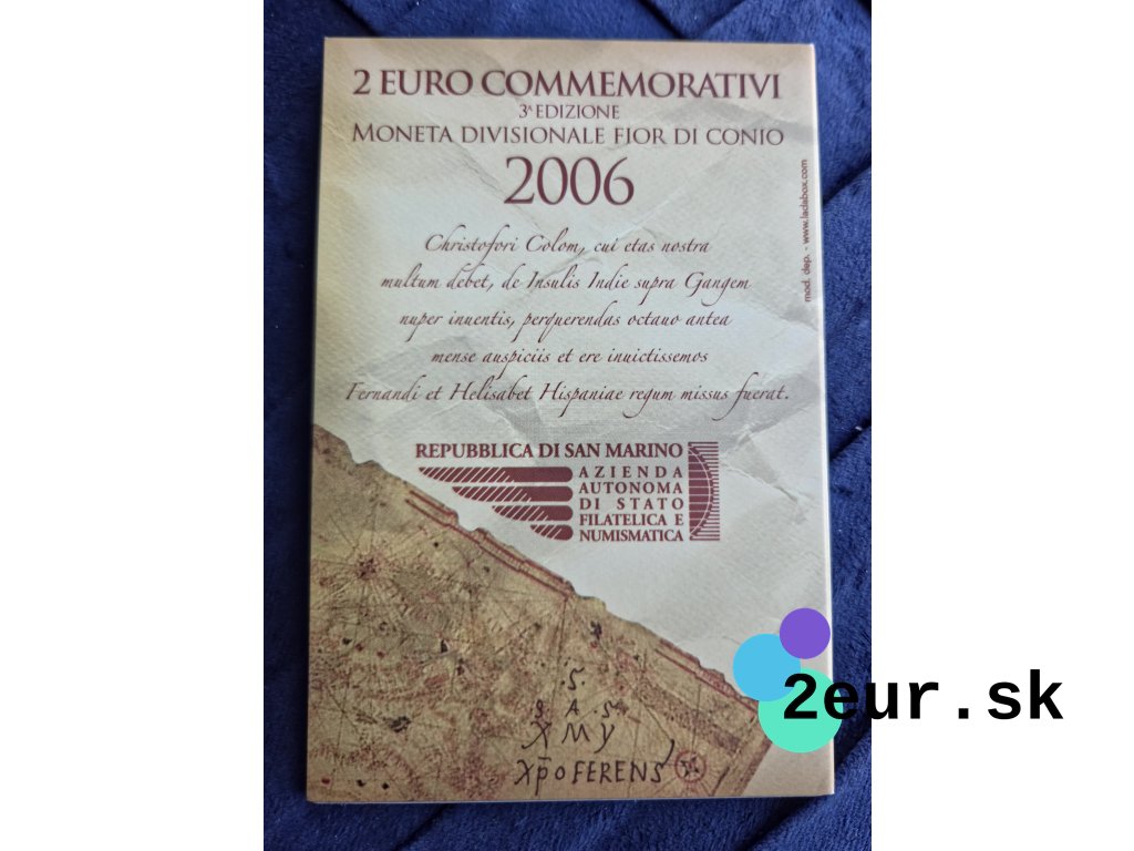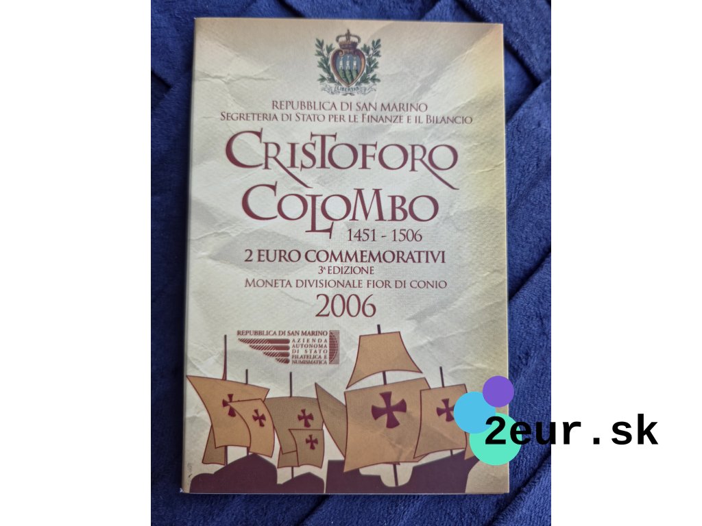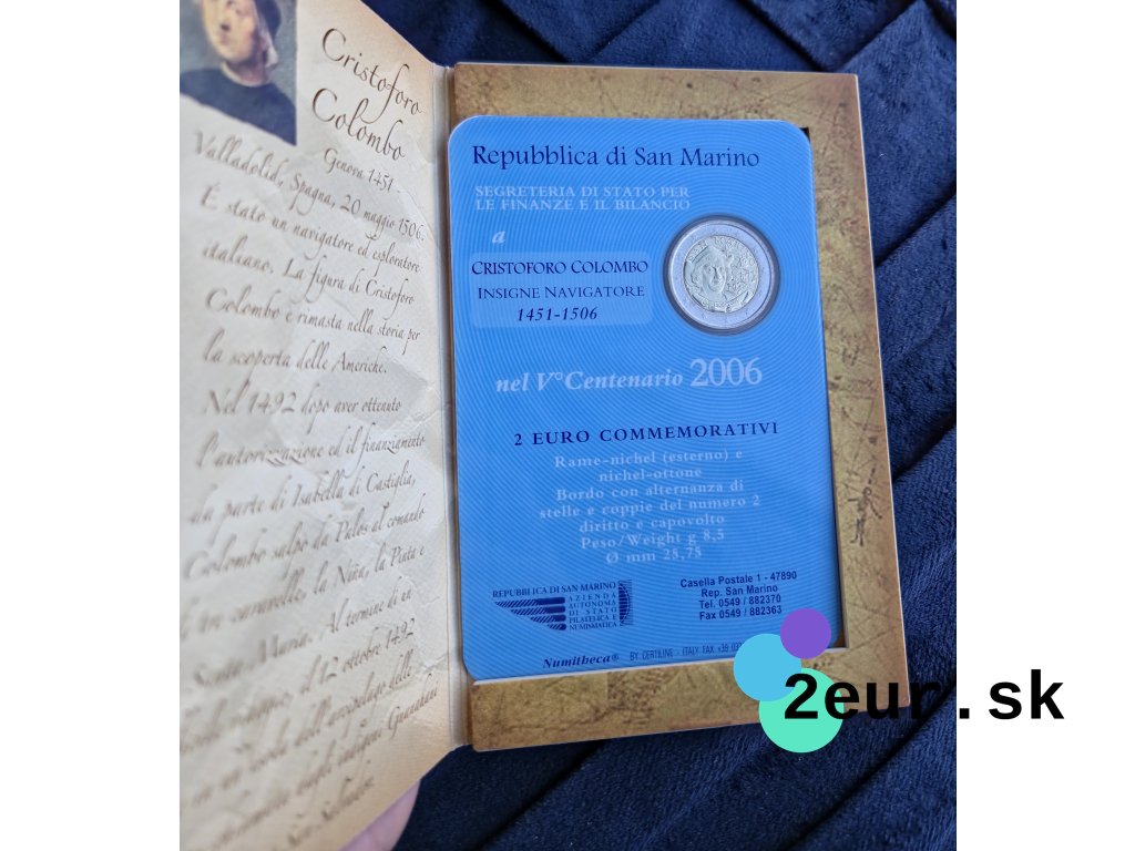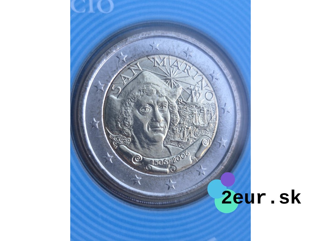 Pamätná 2 eurová minca San Maríno z roku 2006 pripomína 500. výročie úmrtia Krištofa Kolumba, objaviteľa Nového sveta. Na minci je zobrazený portrét slávneho moreplavca s motívom plachetnice, ktorá odkazuje na jeho transatlantické výpravy. Minca vyšla v bežnej kvalite (BU) a je zabalená v oficiálnej pamätnej karte.
