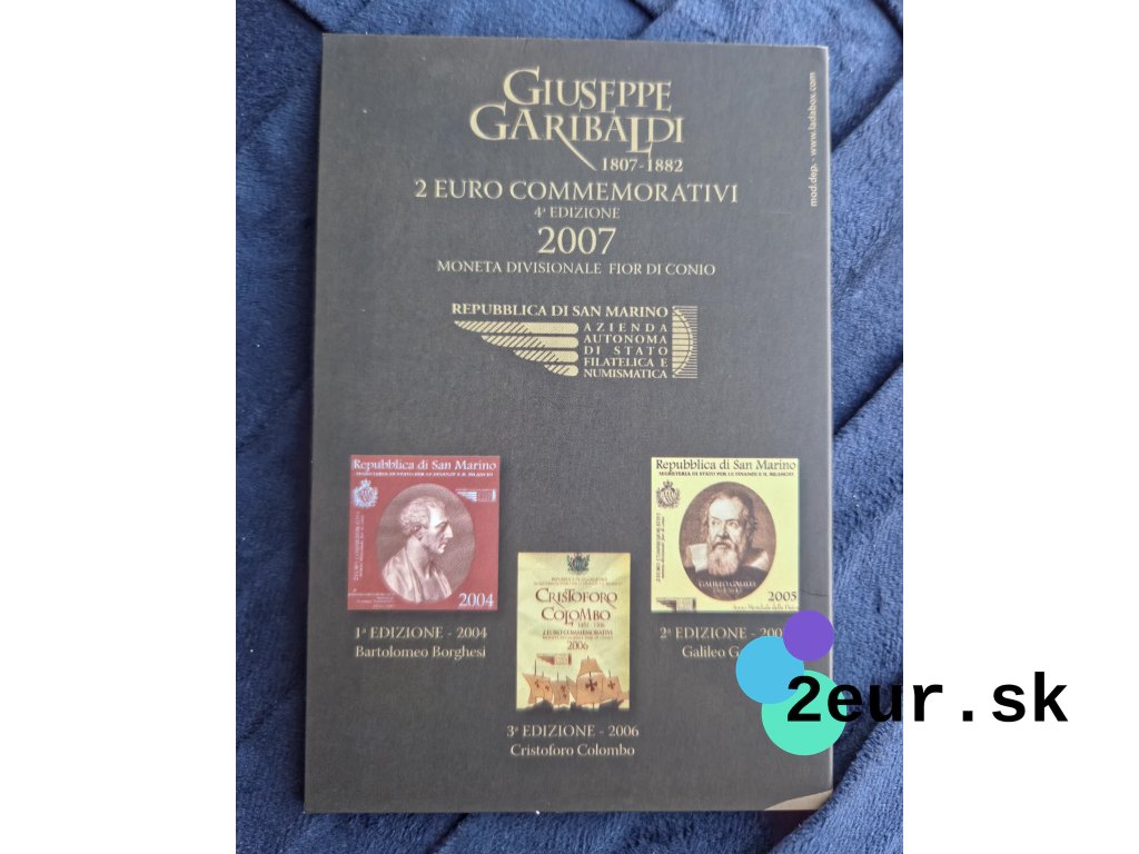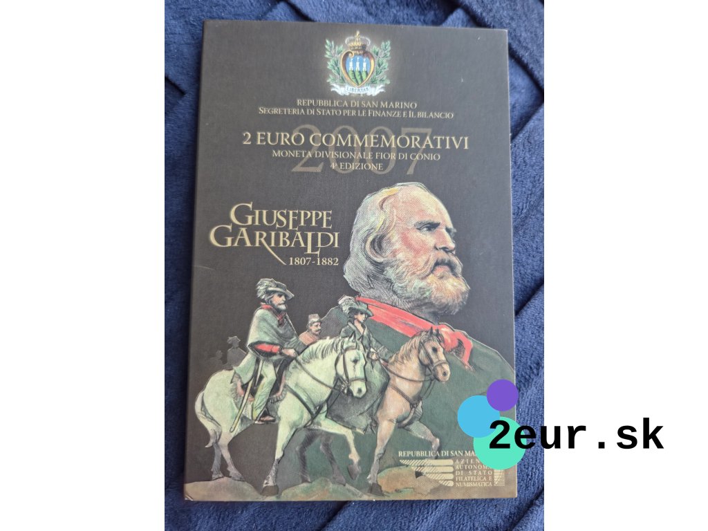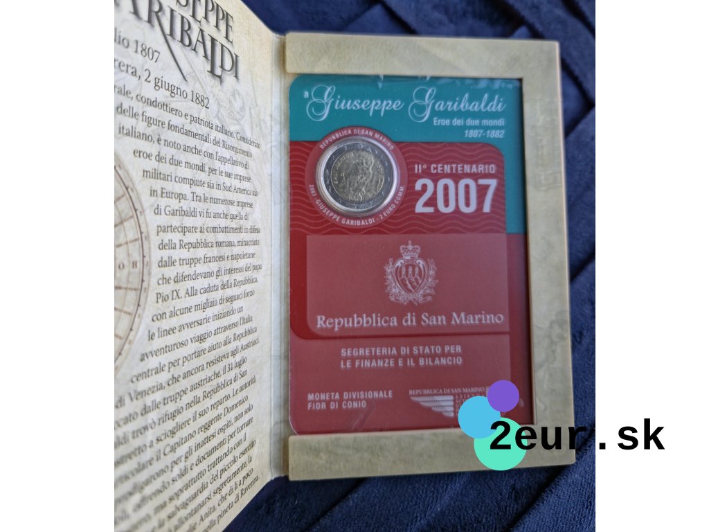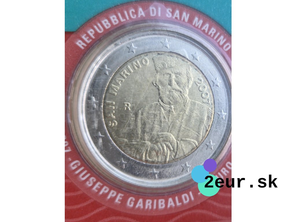 Pamätná 2 eurová minca San Marína z roku 2007 pripomína 200. výročie narodenia Giuseppeho Garibaldiho, významnej postavy talianskeho hnutia za zjednotenie. Na minci je zobrazený portrét tohto národného hrdinu, známeho svojou vojenskou odvahou a úsilím o slobodu a nezávislosť. Emisia odkazuje na Garibaldiho historický prínos nielen pre Taliansko, ale aj pre širší európsky kontext. Minca bola vydaná vo vyhotovení BU a je prezentovaná v oficiálnej pamätnej karte.