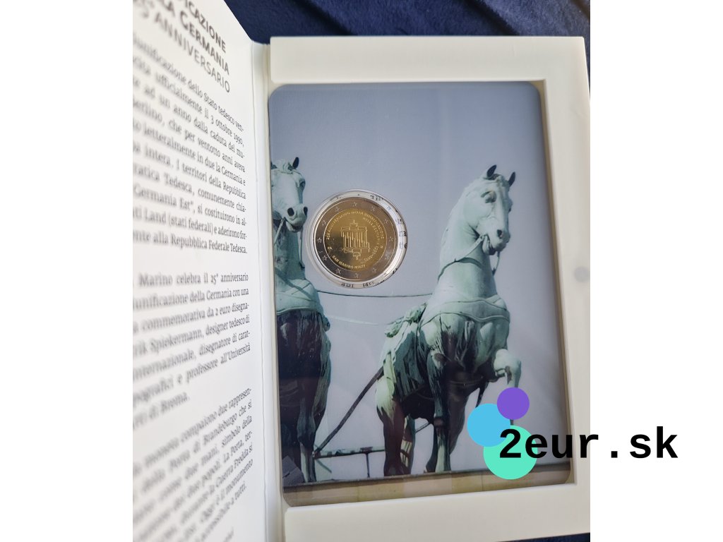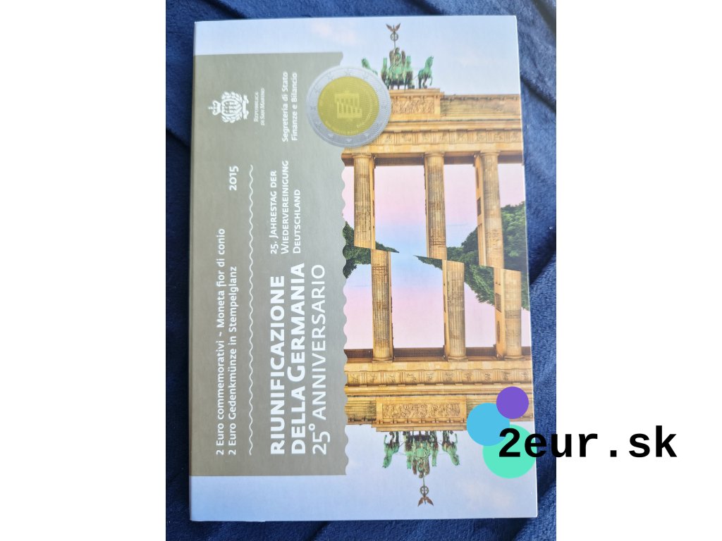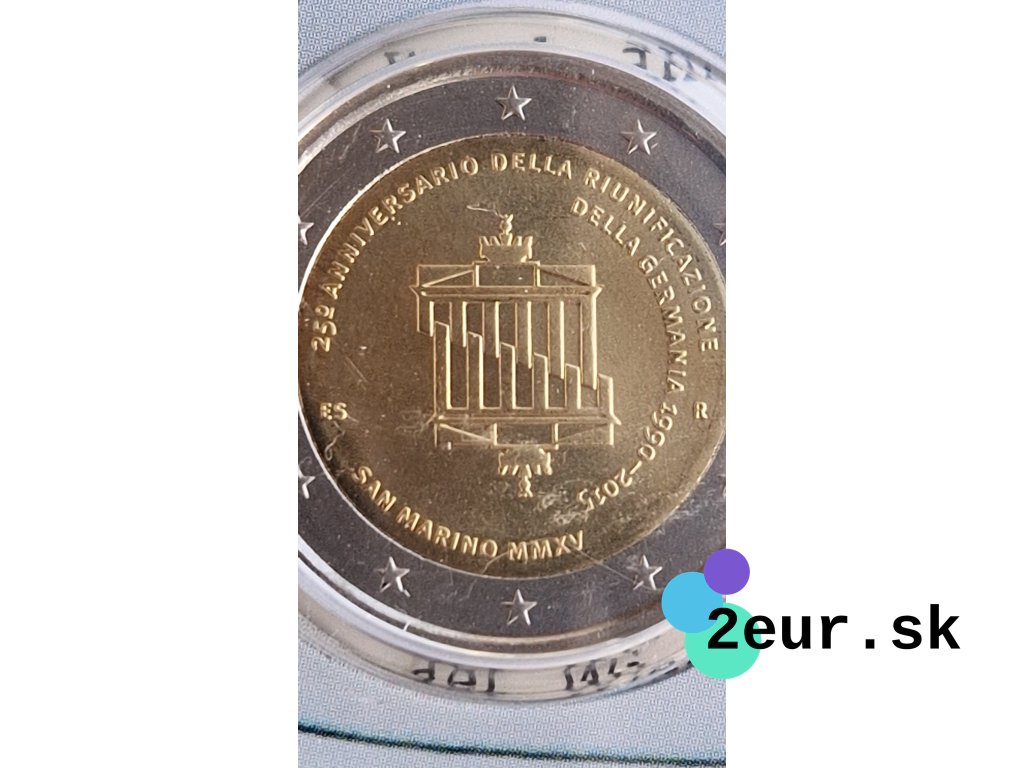 San Maríno v roku 2015 vydalo 2 eurovú mincu pri príležitosti 25. výročia znovuzjednotenia Nemecka, historického momentu, ktorý ukončil desaťročia rozdelenia krajiny. Pád Berlínskeho múru v roku 1989 a následné spojenie východného a západného Nemecka v roku 1990 symbolizovali jednotu a nový začiatok pre Európu. Tento významný míľnik pripomína minca so symbolickým motívom vyjadrujúcim slobodu a zjednotenie.