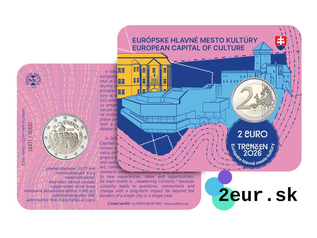 2 eurová minca Slovensko 2026 „Európske hlavné mesto kultúry – Trenčín“ sa dodáva v oficiálnej karte (coincard) s individuálnym číslovaním. Emisia sa viaže na titul EHMK 2026, ktorý prepája súčasné umenie, komunitné projekty a rozvoj kultúrnej infraštruktúry mesta. Minca zvýrazňuje miesto Trenčína na kultúrnej mape Slovenska aj strednej Európy.