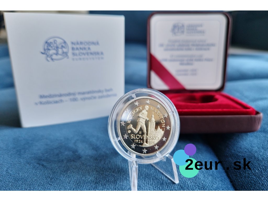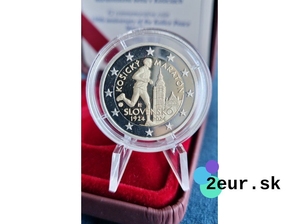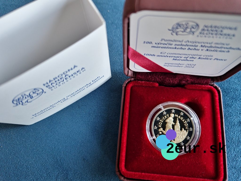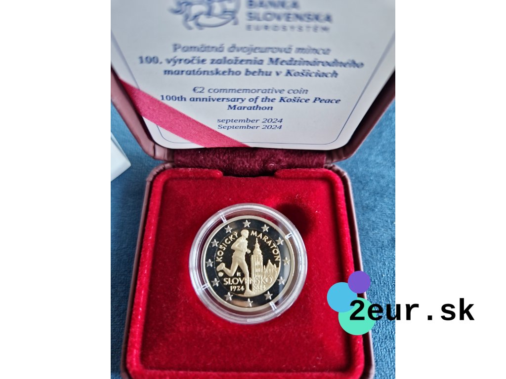 V roku 2024 si Slovensko pripomína 100 rokov Medzinárodného maratónu mieru v Košiciach, najstaršieho maratónu v Európe. Na počesť tejto významnej športovej udalosti bola vydaná 2-eurová pamätná minca, ktorá zdôrazňuje históriu a tradíciu tohto podujatia. Minca v kvalite proof je prezentovaná v elegantnej krabičke s certifikátom.