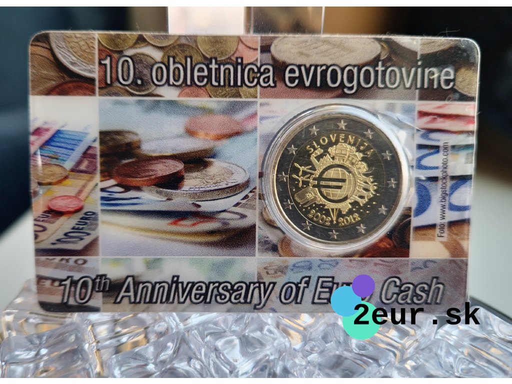 2 eurová minca Slovinsko 2012 „10 rokov eurových bankoviek a mincí“ vychádza vo verzii Proof a dodáva sa v oficiálnej karte. Emisia pripomína zavedenie hotovostného eura v roku 2002 a desať rokov používania spoločnej meny v každodennom živote. Ide o spoločnú emisiu krajín eurozóny z roku 2012.