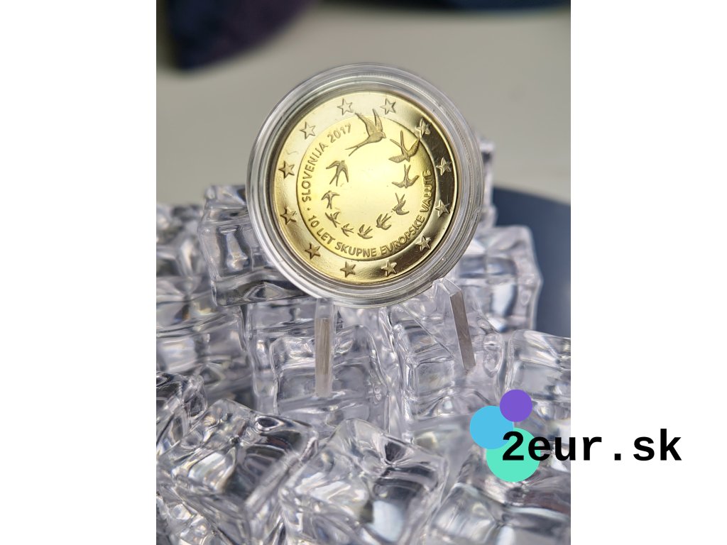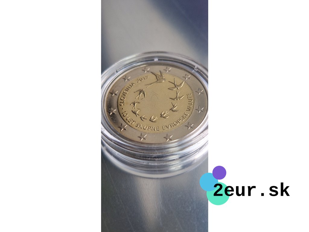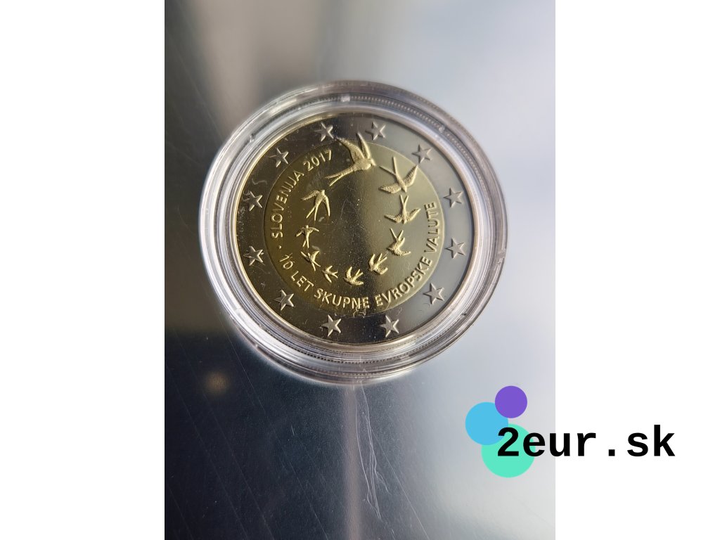 2 eurová minca Slovinsko 2017 v kvalite proof bola vydaná pri príležitosti 10. výročia prijatia eura v Slovinsku. Pripomínala vstup krajiny do eurozóny, ktorý posilnil hospodársku integráciu a uľahčil cezhraničný obchod. Zdôrazňovala význam spoločnej meny pre finančnú stabilitu aj každodenný život obyvateľov. Minca bola vyrazená v najvyššej kvalite proof.