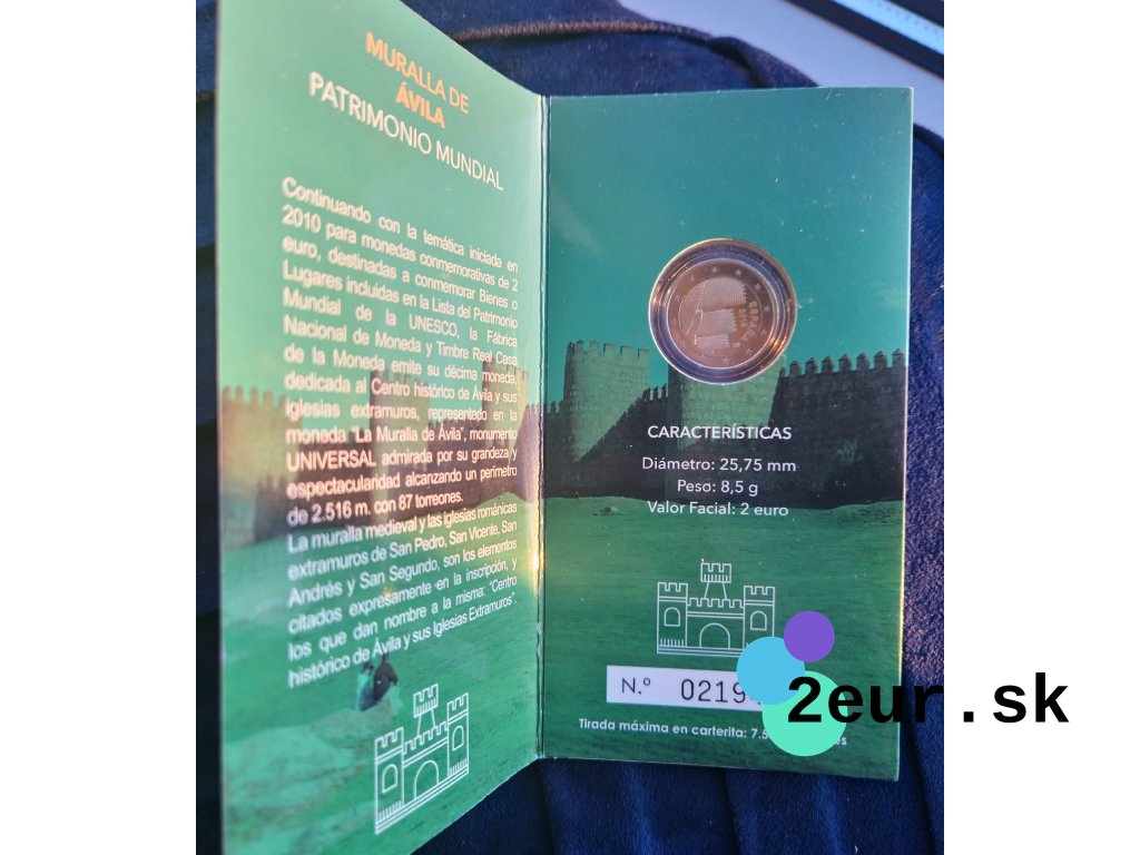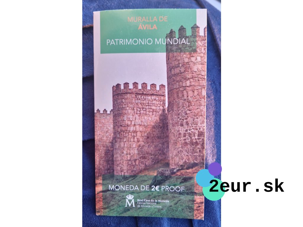Pamätná dvojeurová minca Španielska z roku 2019 je venovaná starému mestu Ávila, ktoré patrí do zoznamu UNESCO. Dizajn mince zachytáva ikonické stredoveké hradby mesta, ktoré sú jedným z najzachovalejších fortifikačných systémov v Európe. Okrem hradieb symbolizuje aj významné kostoly, ktoré stoja mimo mestských brán. Minca v kvalite proof je uložená v elegantnej krabičke, čím podčiarkuje svoju jedinečnú prezentáciu.