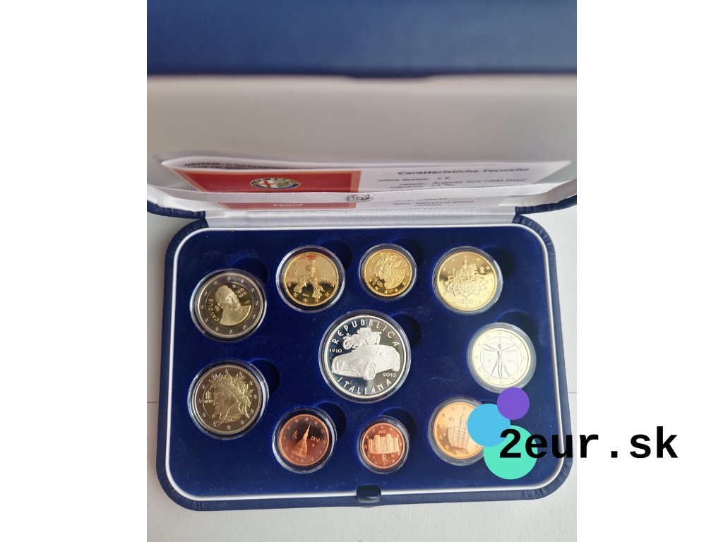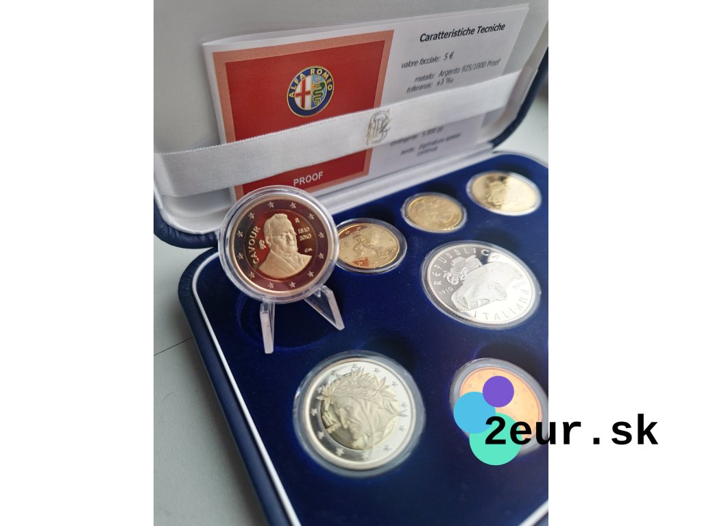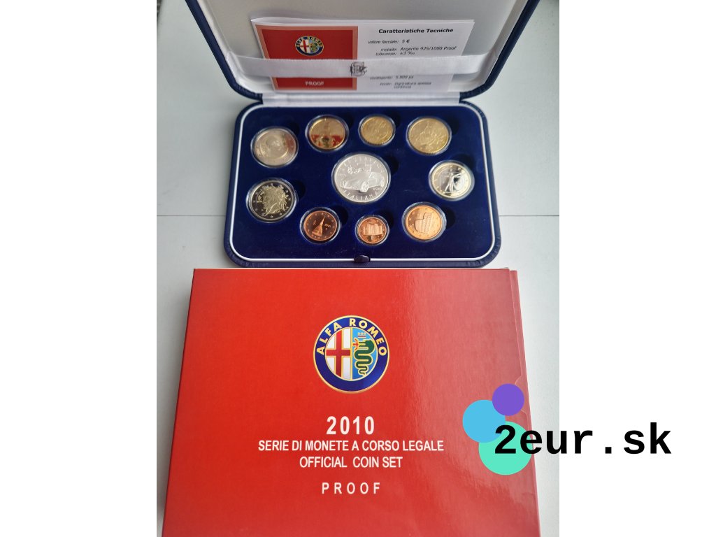 Krajina: Taliansko • Rok: 2010 • Kvalita: Proof • Obsah: 1 c – 2 € (Proof) + 2 € „Cavour 1810–2010“ (Proof – len v tomto sete) + 5 € „100 rokov Alfa Romeo“ (Proof – len v tomto sete) • Strieborná minca: Ag 925/1000, 18,00 g, 32 mm • Náklad: 5 000 ks.