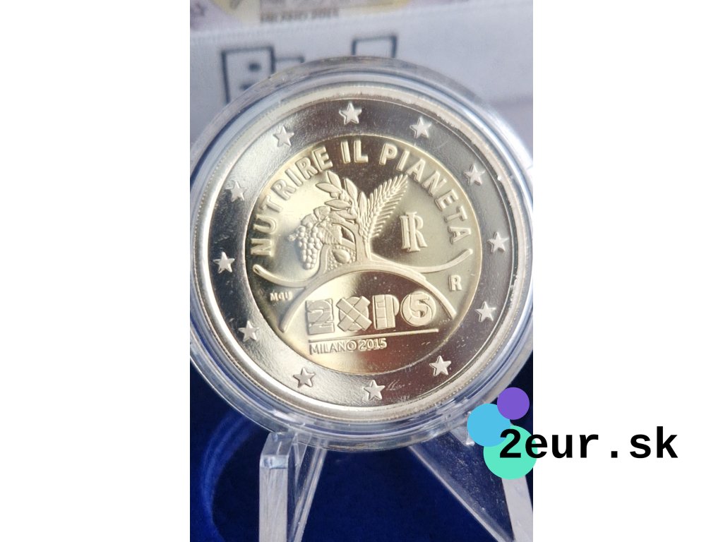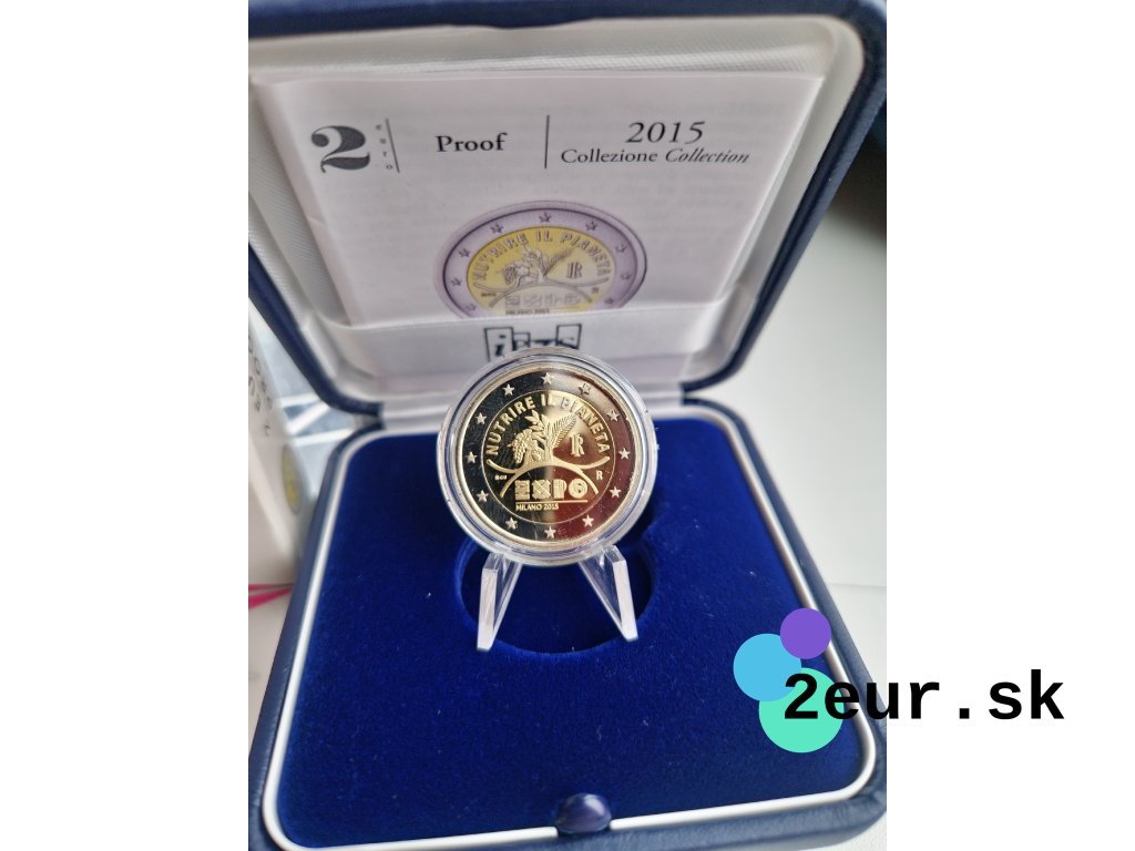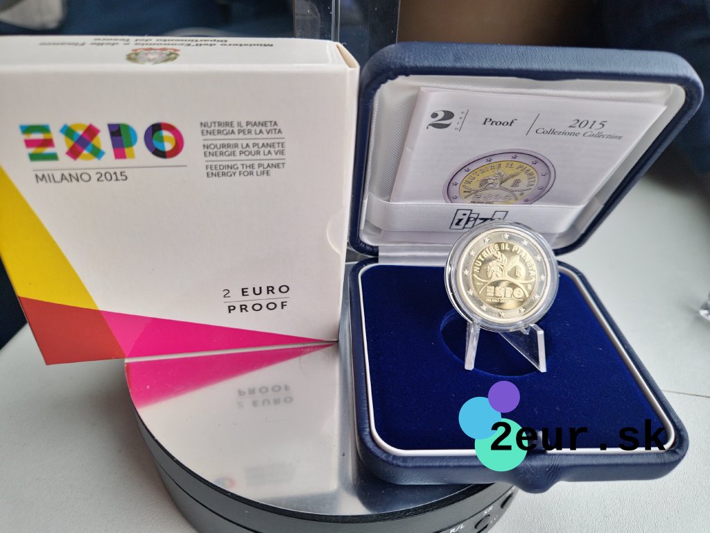 2 eurová minca Taliansko 2015 „EXPO Milano“ vychádza vo verzii Proof a dodáva sa v originálnom puzdre. Svetová výstava EXPO 2015 nesie motto „Feeding the Planet, Energy for Life“ a sústreďuje sa na udržateľné poľnohospodárstvo a budúcnosť potravín. Emisia pripomína úlohu Talianska ako hostiteľa a prezentáciu inovácií, kultúry a gastronómie.