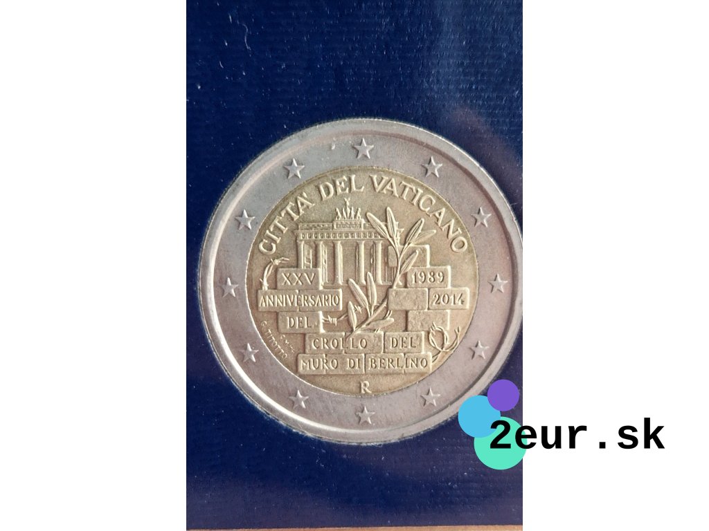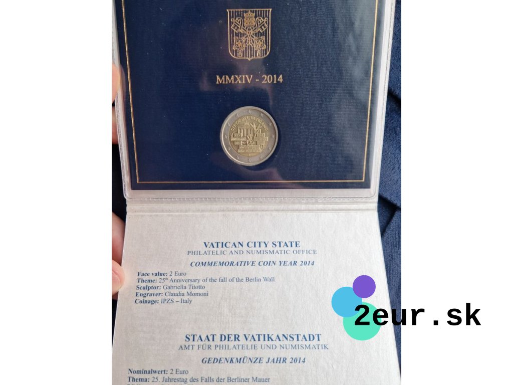 Vatikánska 2-eurová minca z roku 2014 bola vydaná pri príležitosti 25. výročia pádu Berlínskeho múru. Minca symbolizuje dôležitý moment v európskej histórii, ktorý znamenal koniec rozdelenia Nemecka a postupnú zjednocujúcu integráciu Európy. Je dostupná v kvalite BU (brilliant uncirculated) a uložená v pamätnej karte, ktorá podčiarkuje historický a estetický význam tejto emisie.