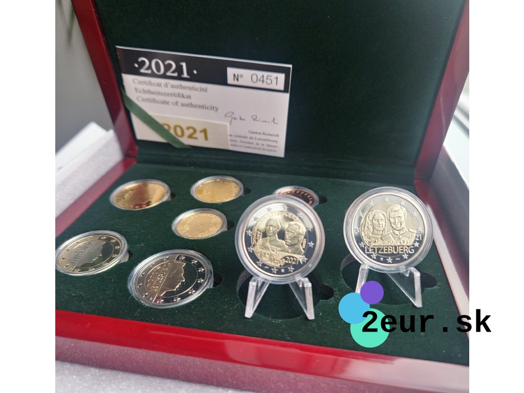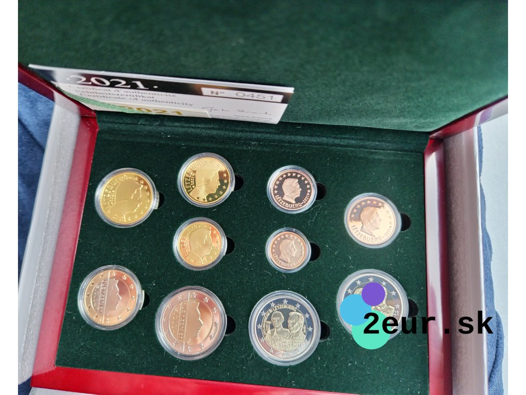 Proof set obsahuje všetky euromince Luxemburska z roku 2021 vrátane dvoch pamätných dvojeurových mincí, ktoré sú vo verzii reliéfnych proof dostupné výhradne v tomto balení.