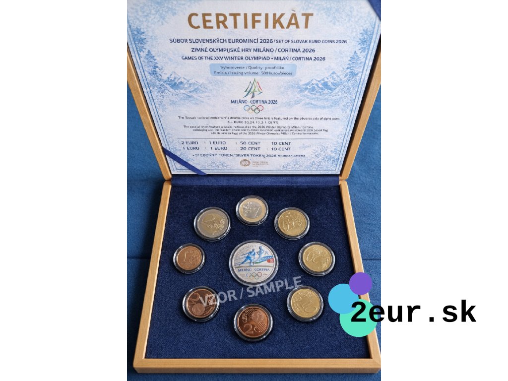 Oficiálny súbor slovenských obehových euromincí 2026 „XXV. ZOH Miláno–Cortina“ vychádza v reprezentatívnom drevenom sete s limitáciou 1 300 kusov. Uprostred setu sa nachádza pamätný žetón, ktorý pripomína zimné olympijské hry v Taliansku. Emisia spája ročníkovú sadu euromincí so športovým podujatím medzinárodného významu.